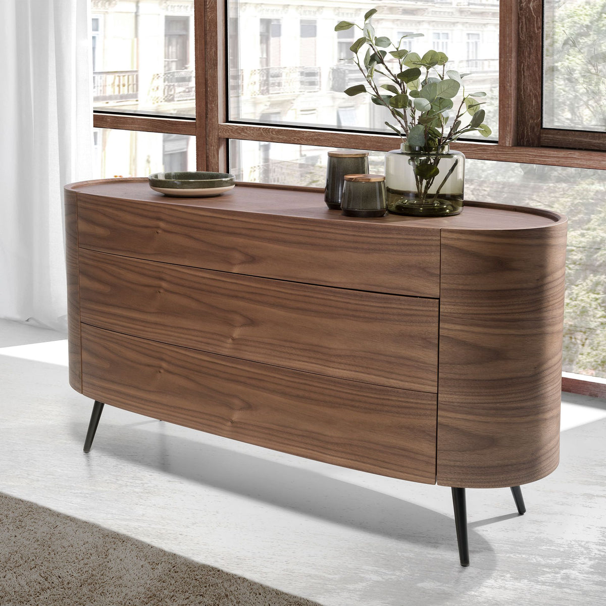 Chest of drawers of modern designwith awooden structure veneered in natural walnutandoriginal black stainless steellegs. It has alarge storage spacewith3 drawerswithfingernail opening systemandsoft-closing system.
