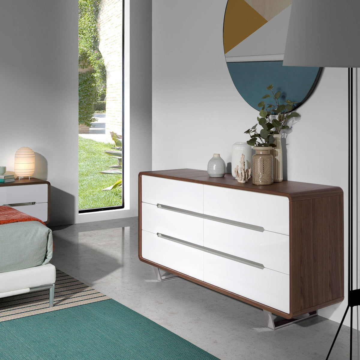 Modern design chest of drawers with natural walnut veneered wood structure and original chromed stainless steel legs. Its original detail in white MDF wood adds the perfect touch of style to your living room. It has a large storage space with 6 drawers with fingernail opening system and soft-closing system.