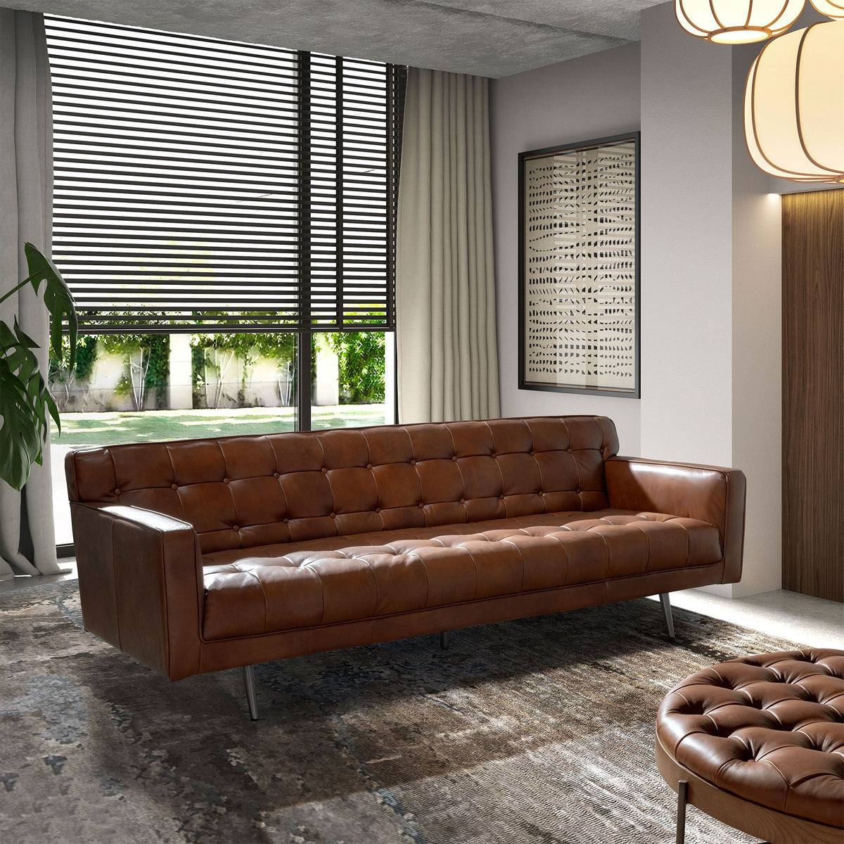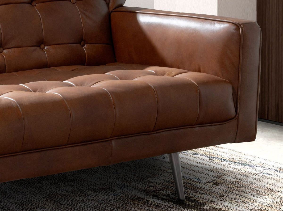 Chester 3 seater sofa of modern design upholstered in dark brown cowhide leather. Both for its style and its darkened stainless steel legs, this sofa will bring a touch of avant-garde and elegance that you are looking for in your home.