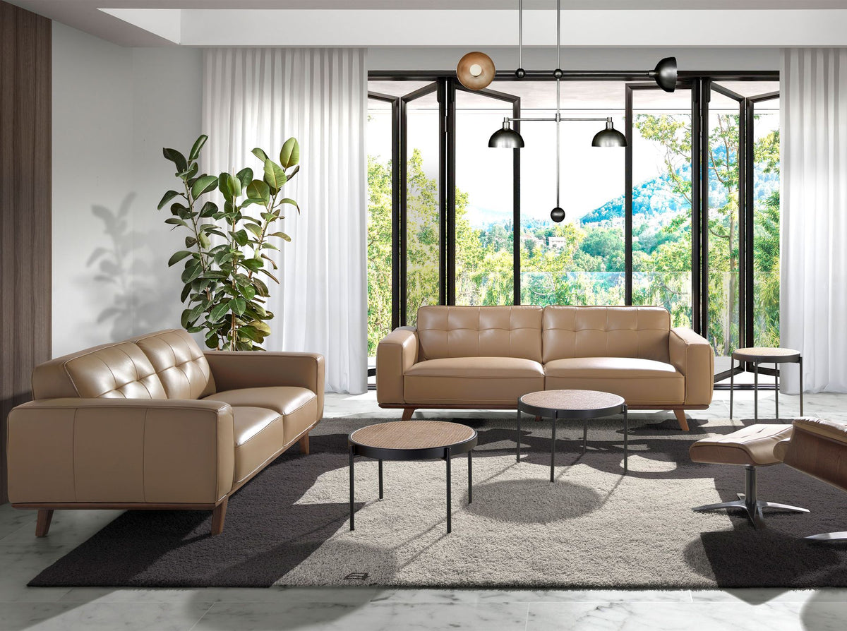 Chester 3 seater sofa of modern design upholstered in sand coloured cowhide leather. Both for its style and its walnut-coloured wooden legs, this sofa will bring the touch of avant-garde and elegance you are looking for in your home.