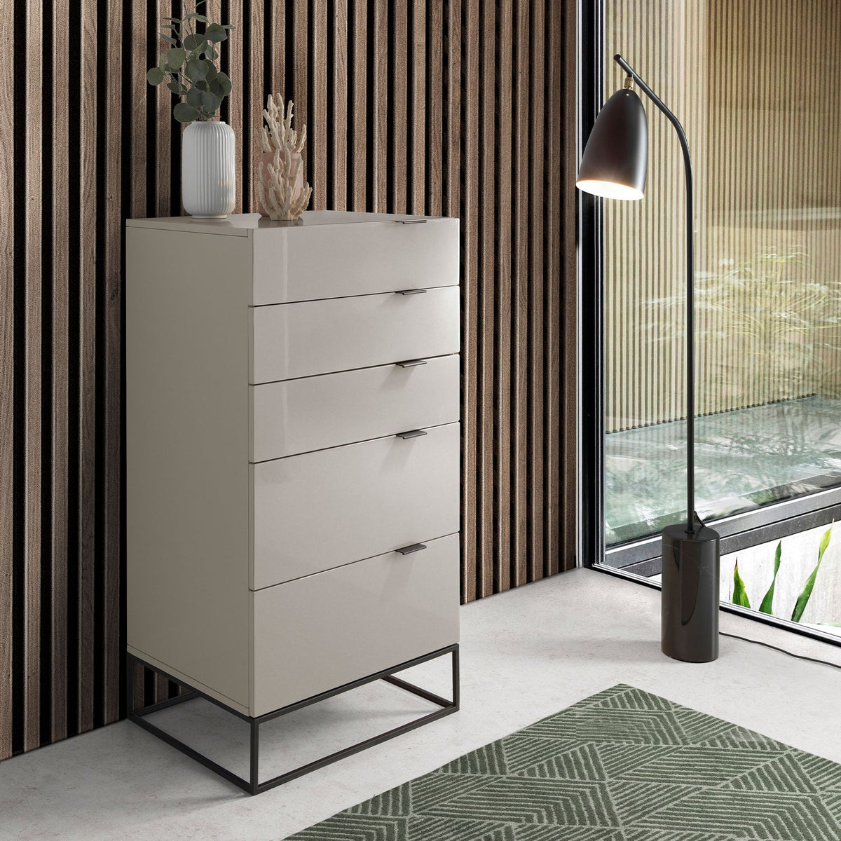 Modern design chiffonierwithgrey MDF woodstructure andoriginal black epoxy painted stainless steellegs. It has alarge storage spacewith5 drawerswithtongue-and-groove opening systemandsoft-closing system.