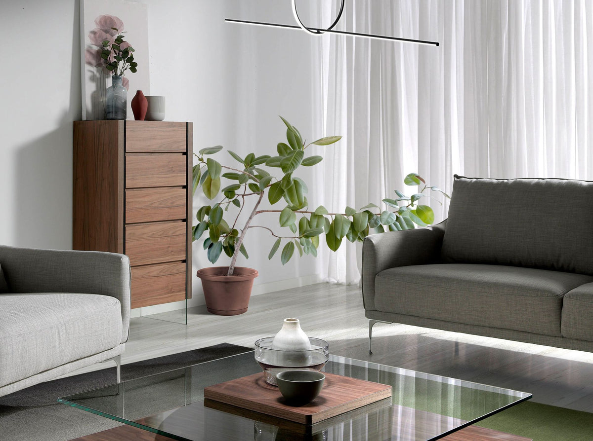 Modern design chiffonierwithnatural walnut veneered woodstructure andoriginal tempered glasslegs. It has alarge storage spacewith5 drawerswithfingernail opening systemandsoft-closing system.