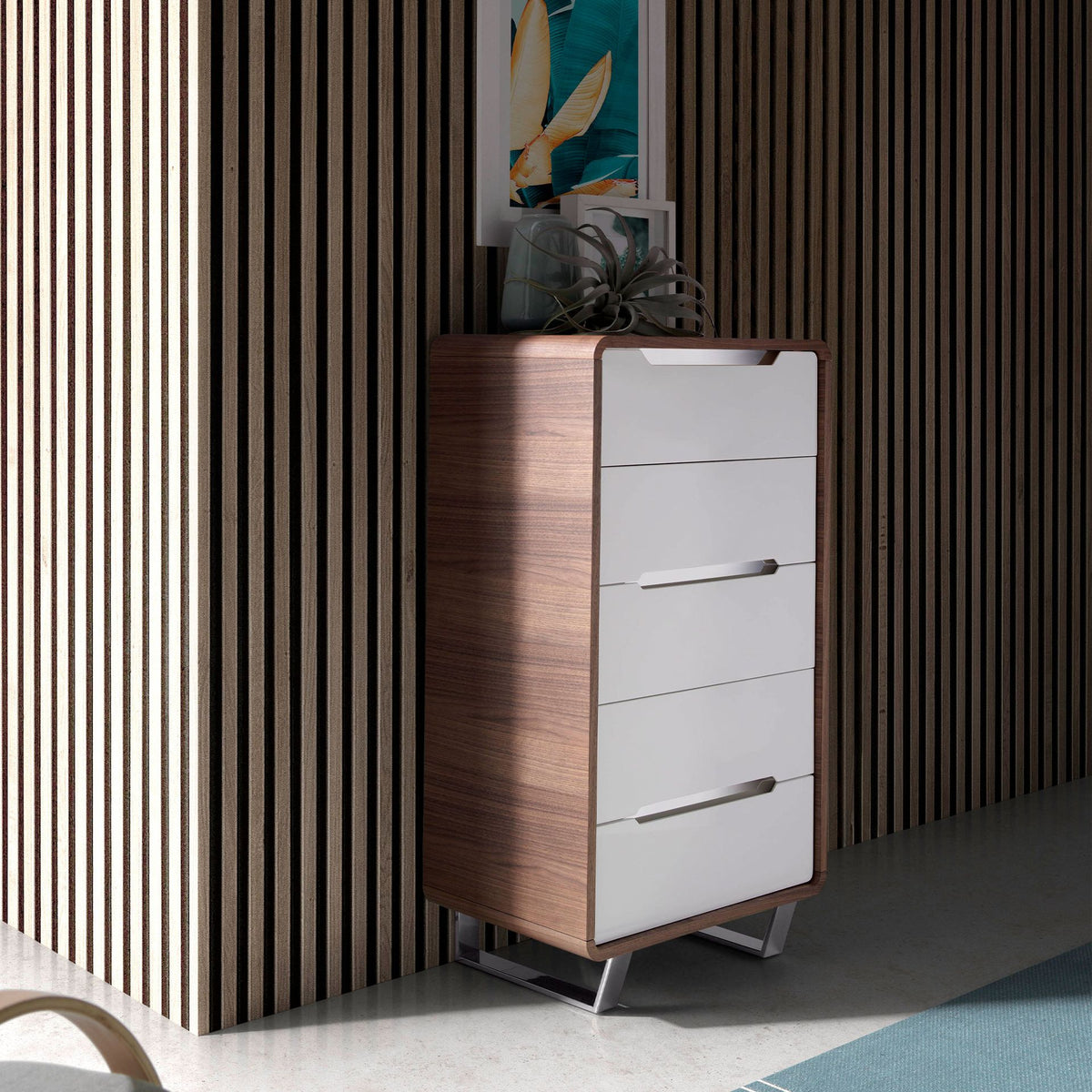 Modern design chiffonierwithnatural walnut veneered woodstructure andoriginal chromed stainless steellegs. Itsoriginal detail in white MDF woodadds the perfect touch of style to your living room. It has alarge storage spacewith5 drawerswithfingernail opening systemandsoft-closing system.