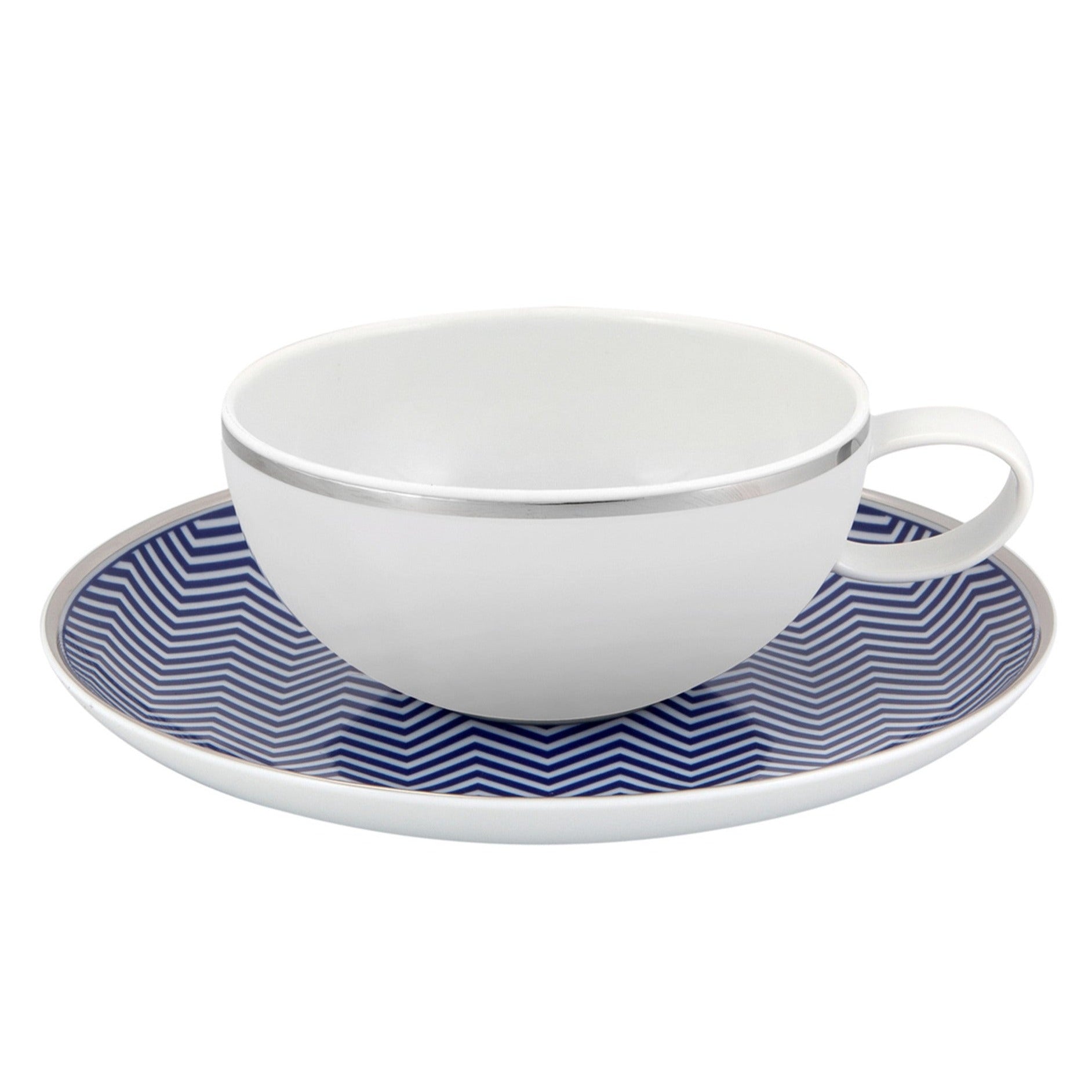 Transform your table setting with the Harvard Tea Cup & Saucer, part of the exquisite Domo Collection. Designed to add a touch of elegance to any dining occasion, this stunning tea cup features a captivating decoration in bright blue and platinum, showcasing a harmonious array of geometric shapes that embody classic American New England style while offering an irresistible casual-chic flair.