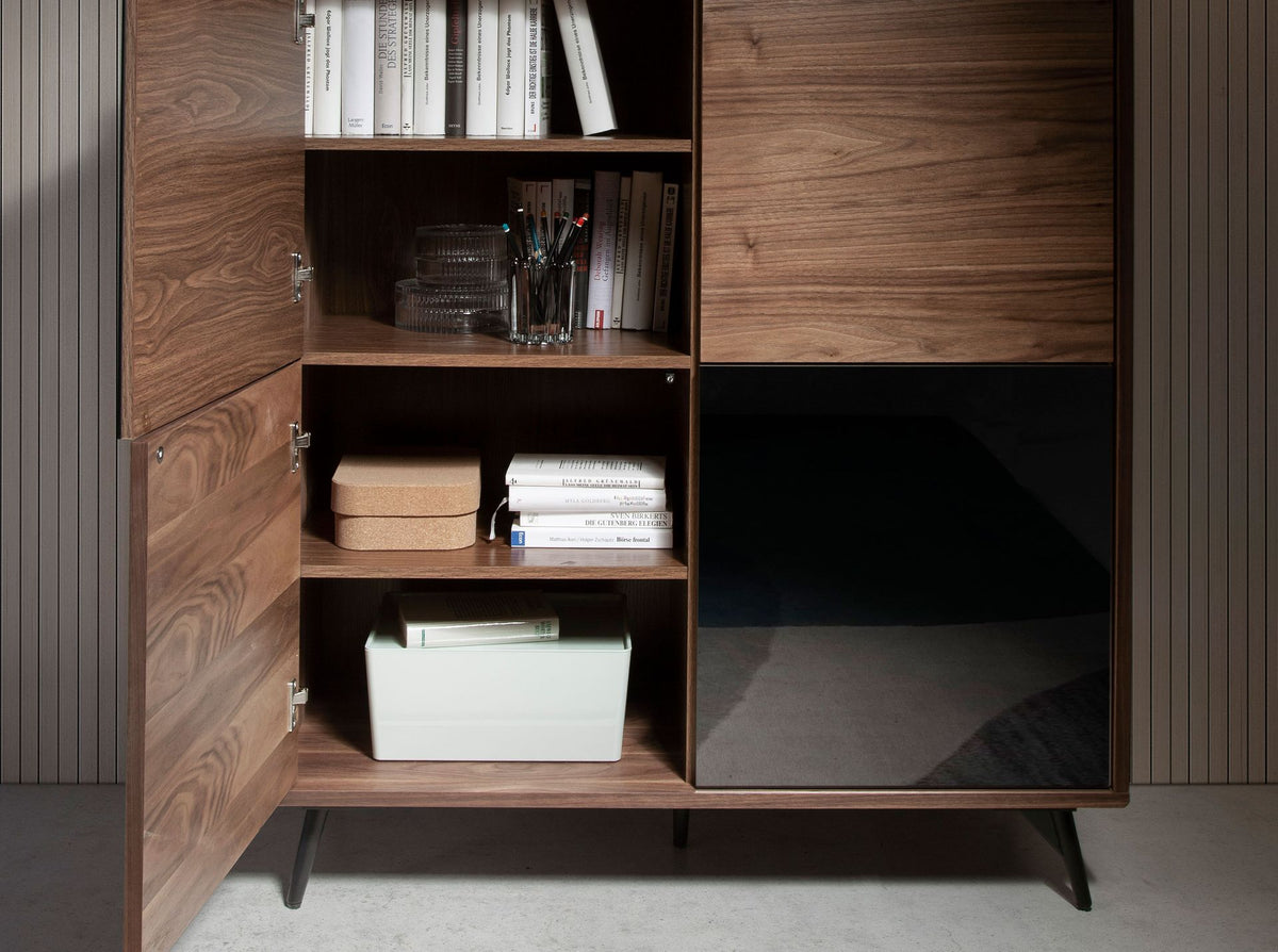 Modern design high sideboardwithwooden structure veneered in natural walnutandoriginal black epoxy painted stainless steellegs. Itsoriginal black mirror effect glass detailadds the perfect touch of style to your living room. It has alarge storage spacewith4 doorswithpush and pull opening systemandsoft-closing system.