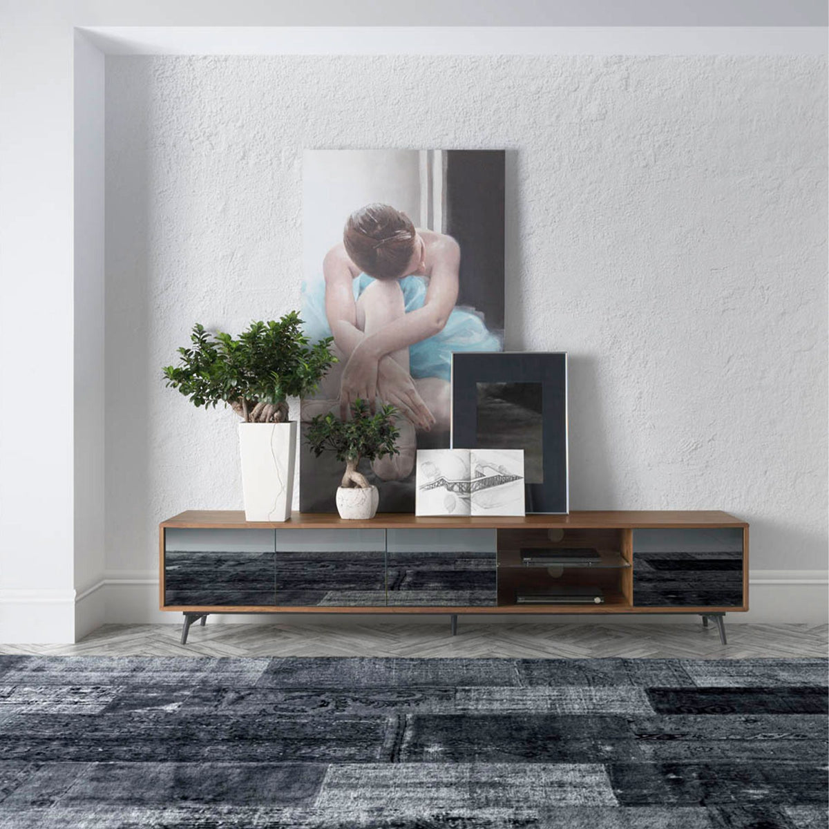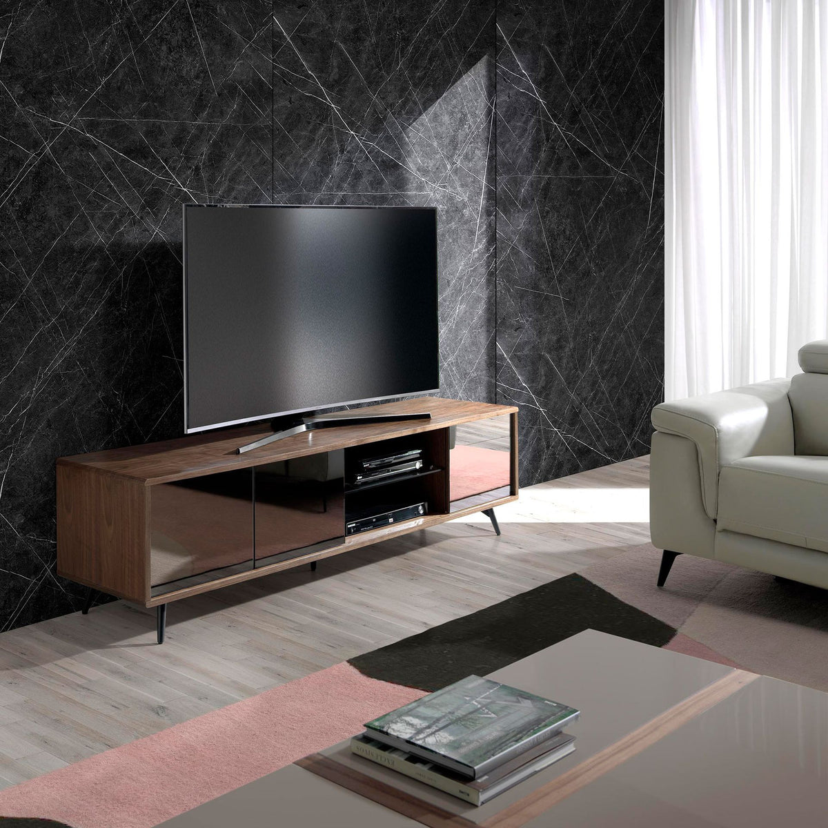 - An elegant and sophisticatedtv stand made of 0,5 mm thick natural walnut veneer, which will give your living room the modern and warm touch you are looking for.