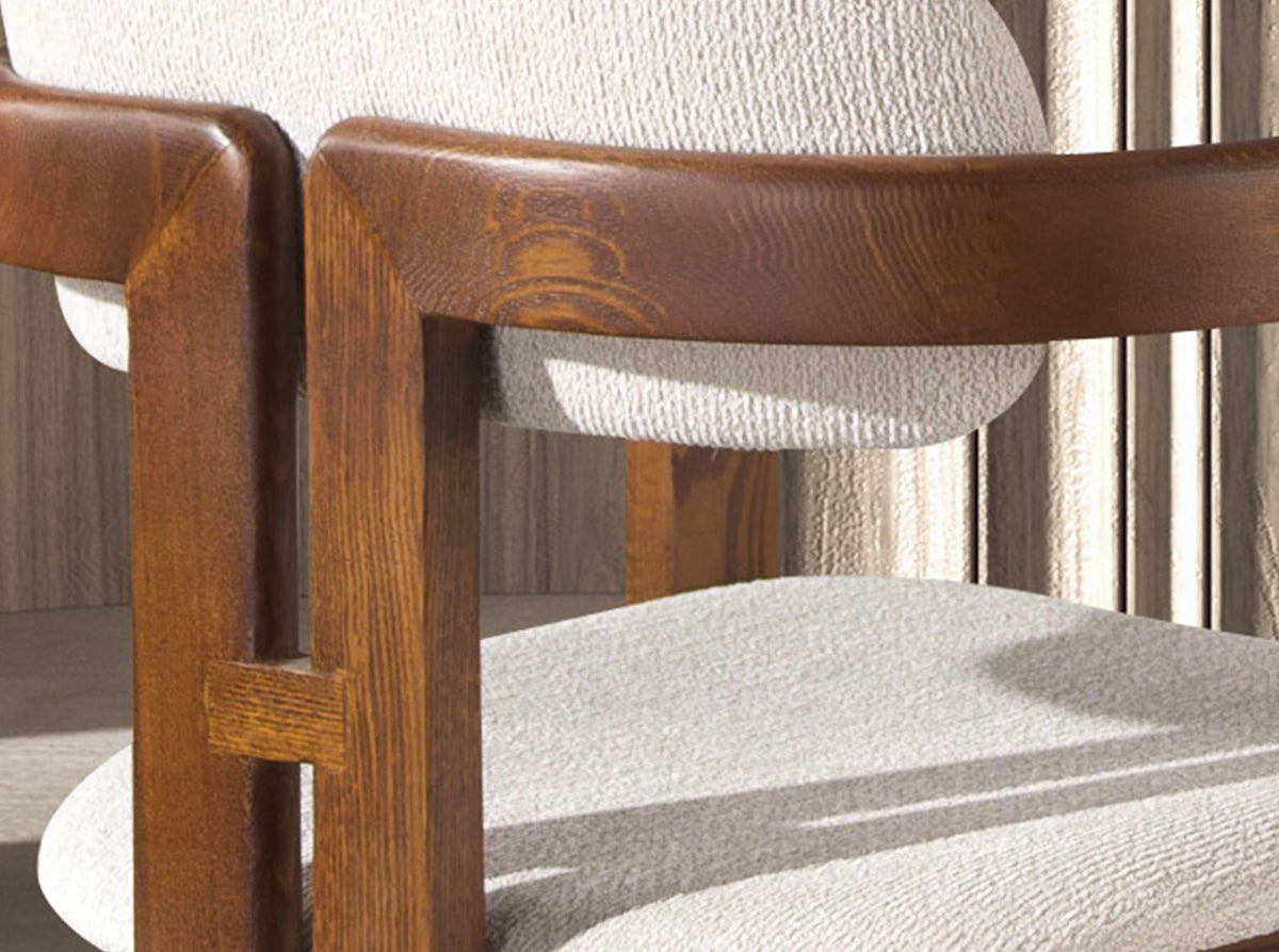 Chair with armrests in a modern designwith seat and backrest upholstered inoff-white fabric. Itswalnut-coloured woodenlegs in an avant-garde yet timeless style will make it a must-have for your kitchen or dining room. Thischair by Angel Cerdácombines the unique and personal style of the brand, as well asthe highest comfort and stability, thanks to the high quality of its upholstery and the original structure of its legs.