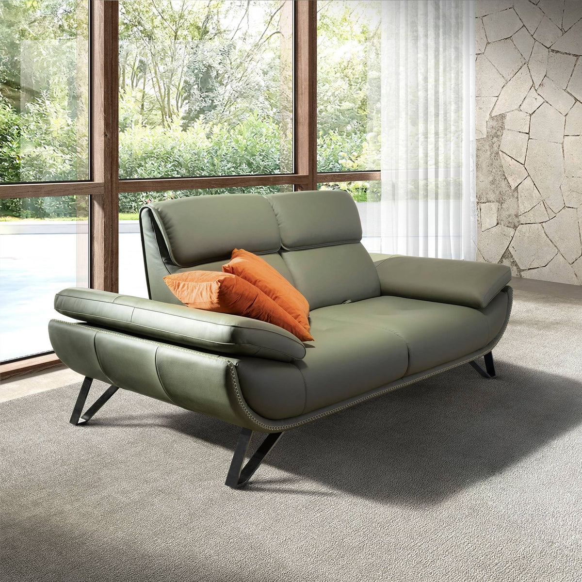 2 seater sofa of modern design upholstered in olive green cowhide leather. Both for its style and its dark chromed stainless steel legs, this sofa will bring the touch of avant-garde and elegance you are looking for for your home.