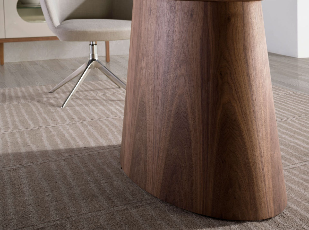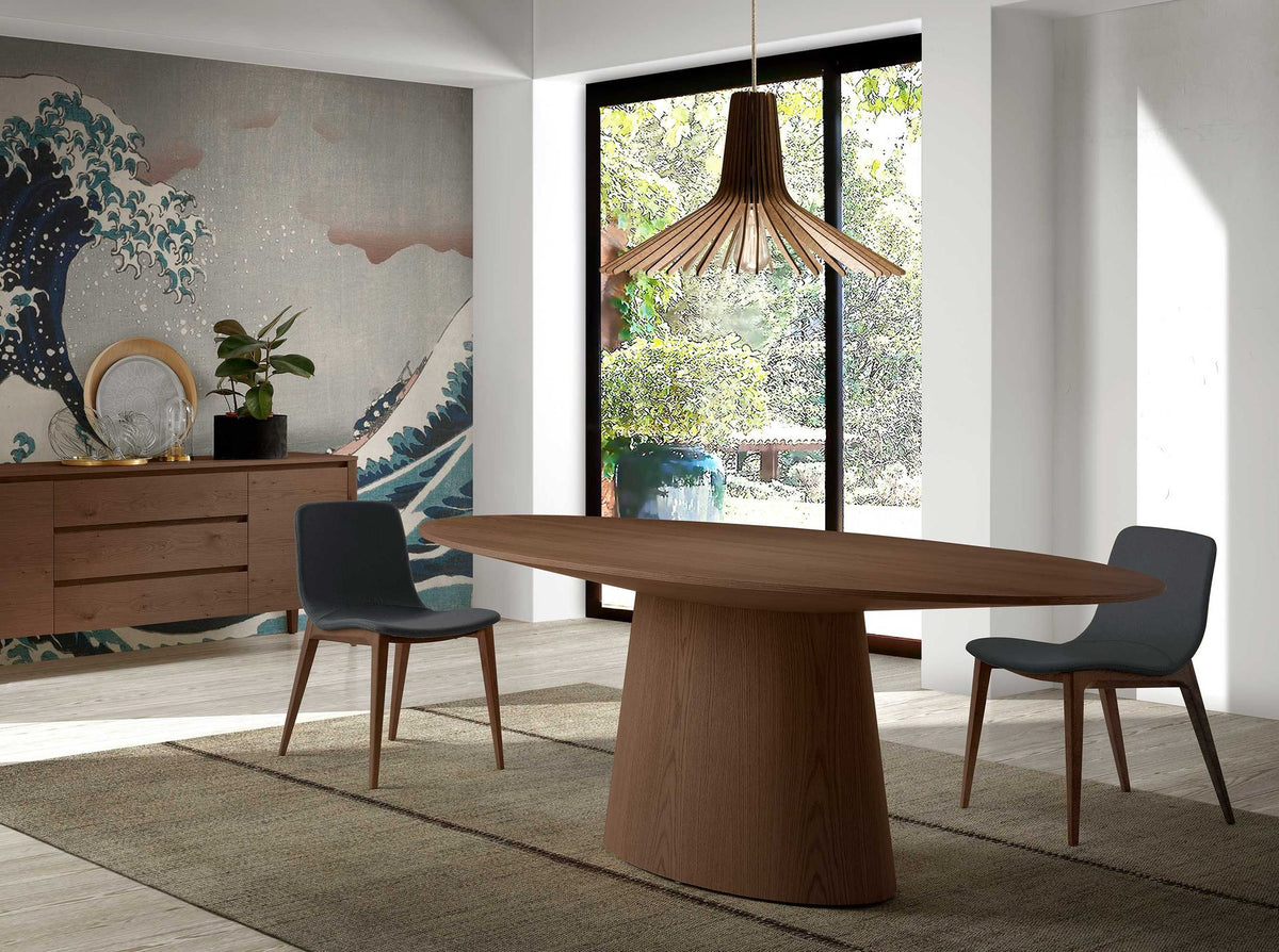 Modern oval dining table with fixed top and natural walnut veneered wood frame. A perfect table to bring light and modernity to your kitchen, living room or dining room.
