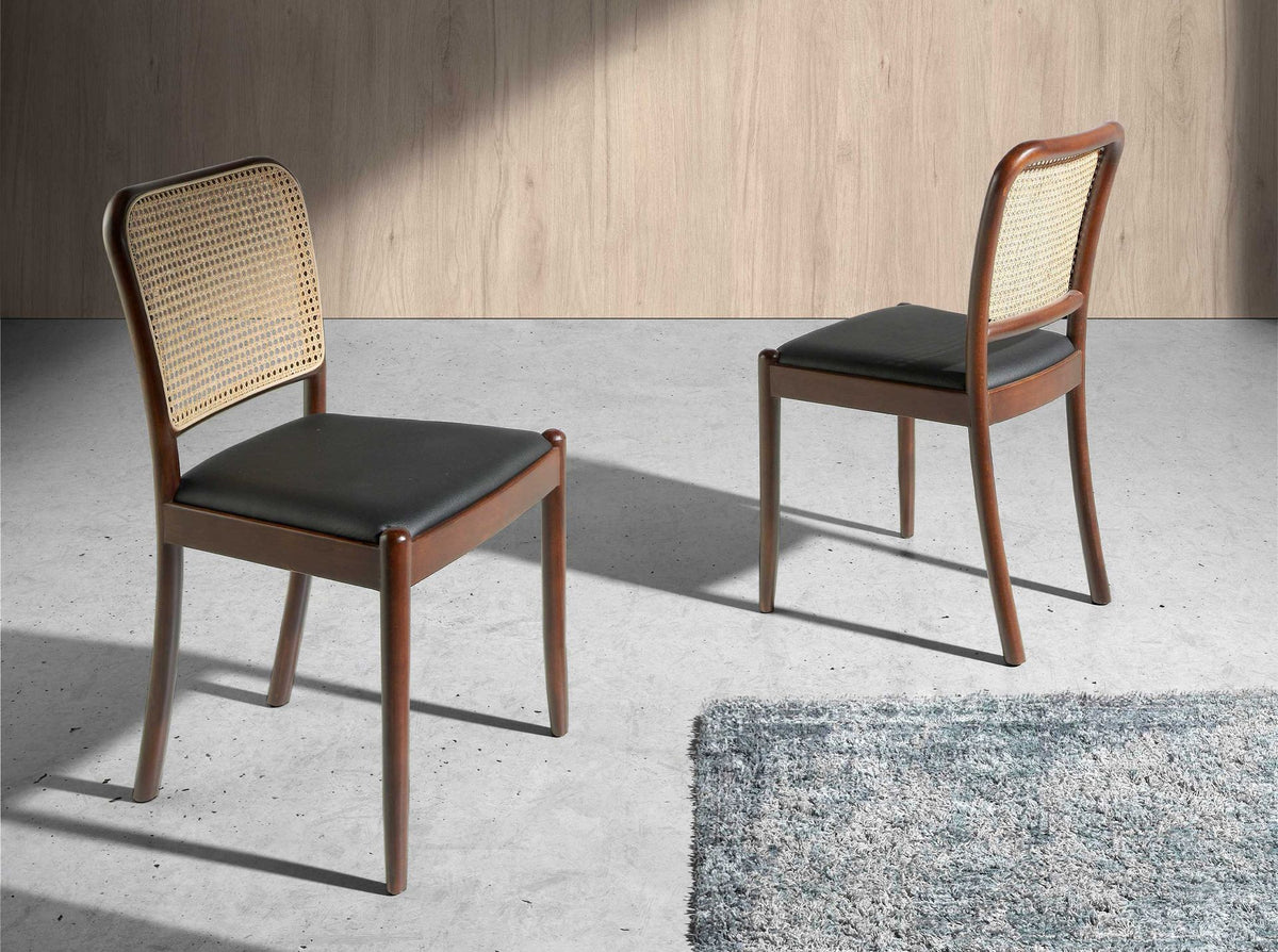 Modern design chair with black leatherette upholstered seat and rattan backrest. Both its gold-coloured chromed stainless steel detailing and its walnut-coloured wooden legs in an avant-garde yet timeless style will make it a must-have for your kitchen or dining room. This chair by Angel Cerdá combines the unique and personal style of the brand, as well as the greatest comfort and stability, thanks to the high quality of its upholstery and the original structure of its legs.