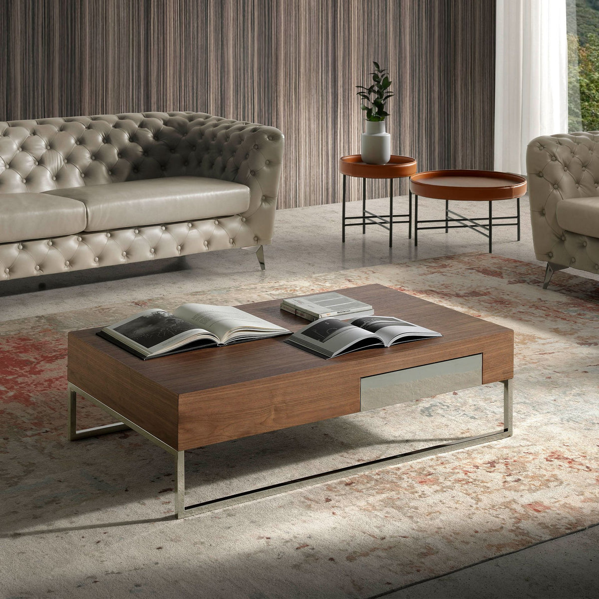 Rectangular coffee table with a modern design made of wood veneered in natural walnut. Its structure of chromed stainless steel legs brings the touch of modernity and avant-garde that you are looking for for your home. Its original chrome-plated stainless steel details add the perfect touch of style to your living room. It has a large storage space with 1 drawer with push and pull opening system and soft-closing system.