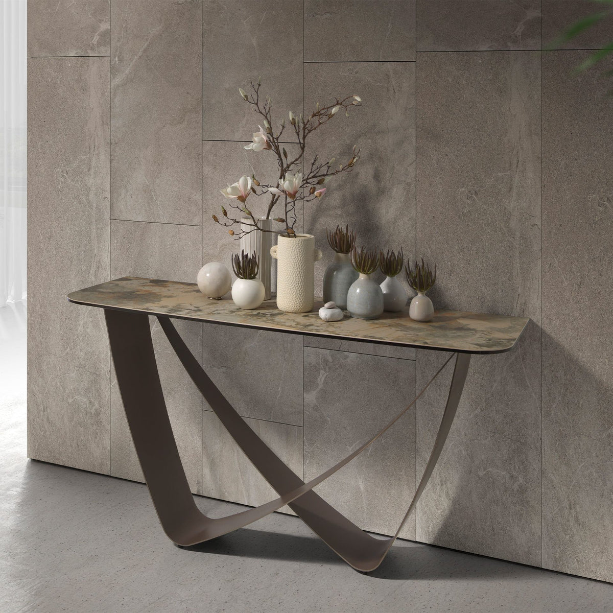Modern rectangular consoletable with aporcelain marble top in earth and grey tones in matt finishand original legs instainless steel painted in taupe metallic finish. A piece with asimple yet original designthat will add a unique and personal touch.