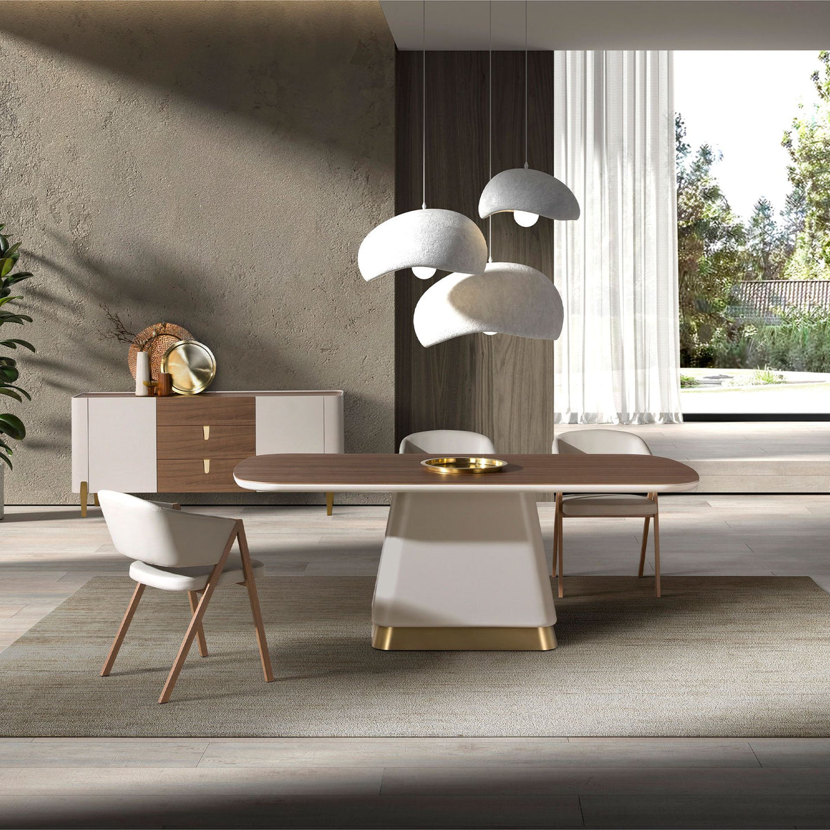 Modern design rectangular dining tablewith fixedtop in natural walnut veneer. Its originalbeige MDF wooden legs,together with itspolished gold-coloured stainless steel base, are key elements to highlight in its design.