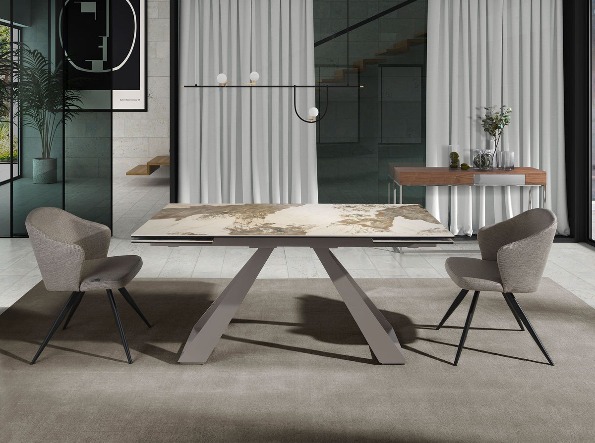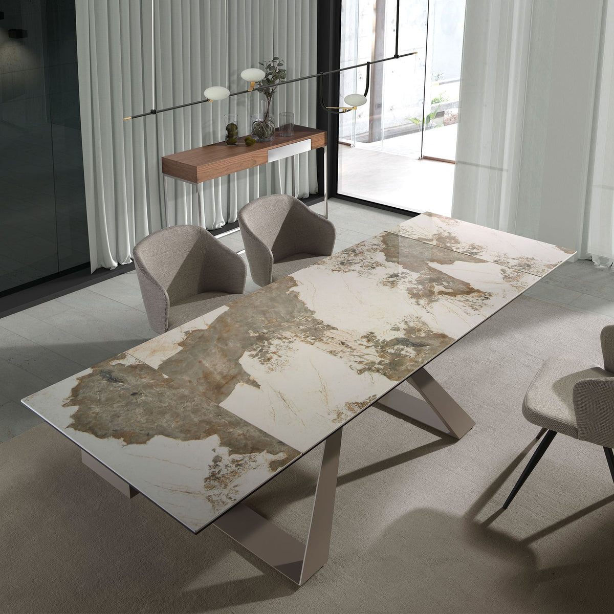Modern design rectangular extendable dining tablewithwhite porcelain marble top with earth tone veins in glossy finish. Itstaupe grey painted steellegs and its adaptability make it a fully functional and versatile piece of furniture for everyday use.