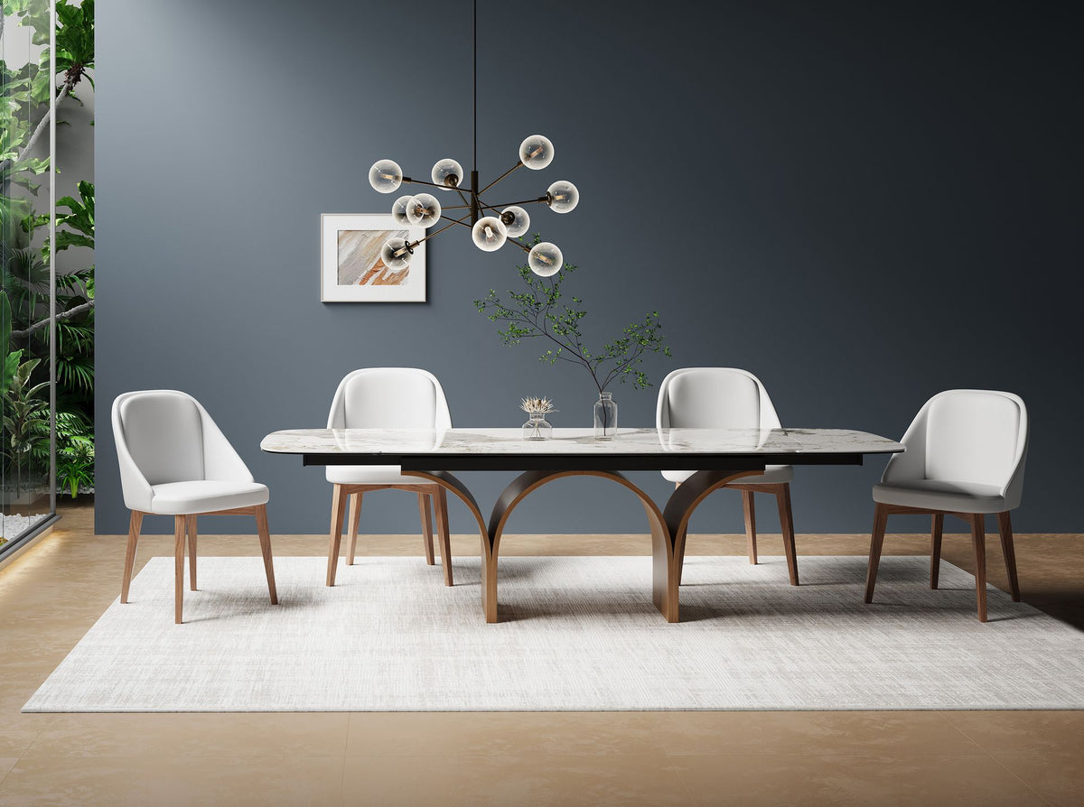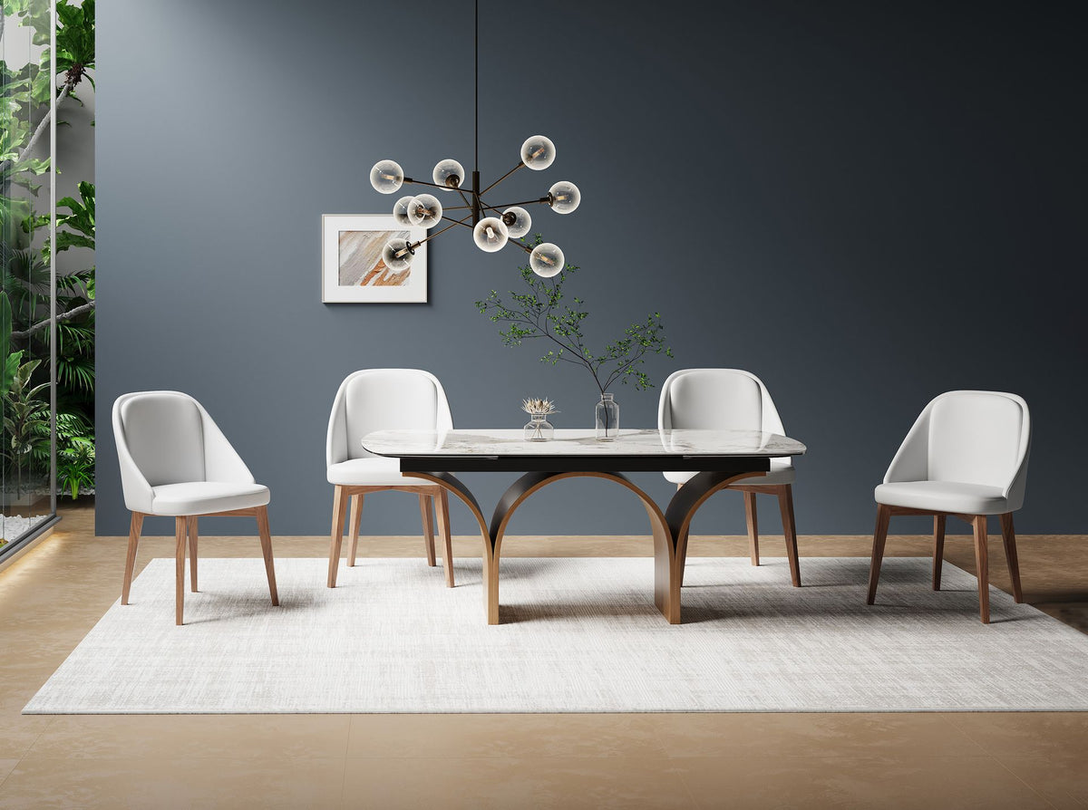 Modern design rectangular extendable dining tablewithwhite porcelain marble top with earth-toned veins in gloss finish. Itslacquered stainless steel legs imitating walnut woodand its adaptability make it a fully functional and versatile piece of furniture for everyday use.