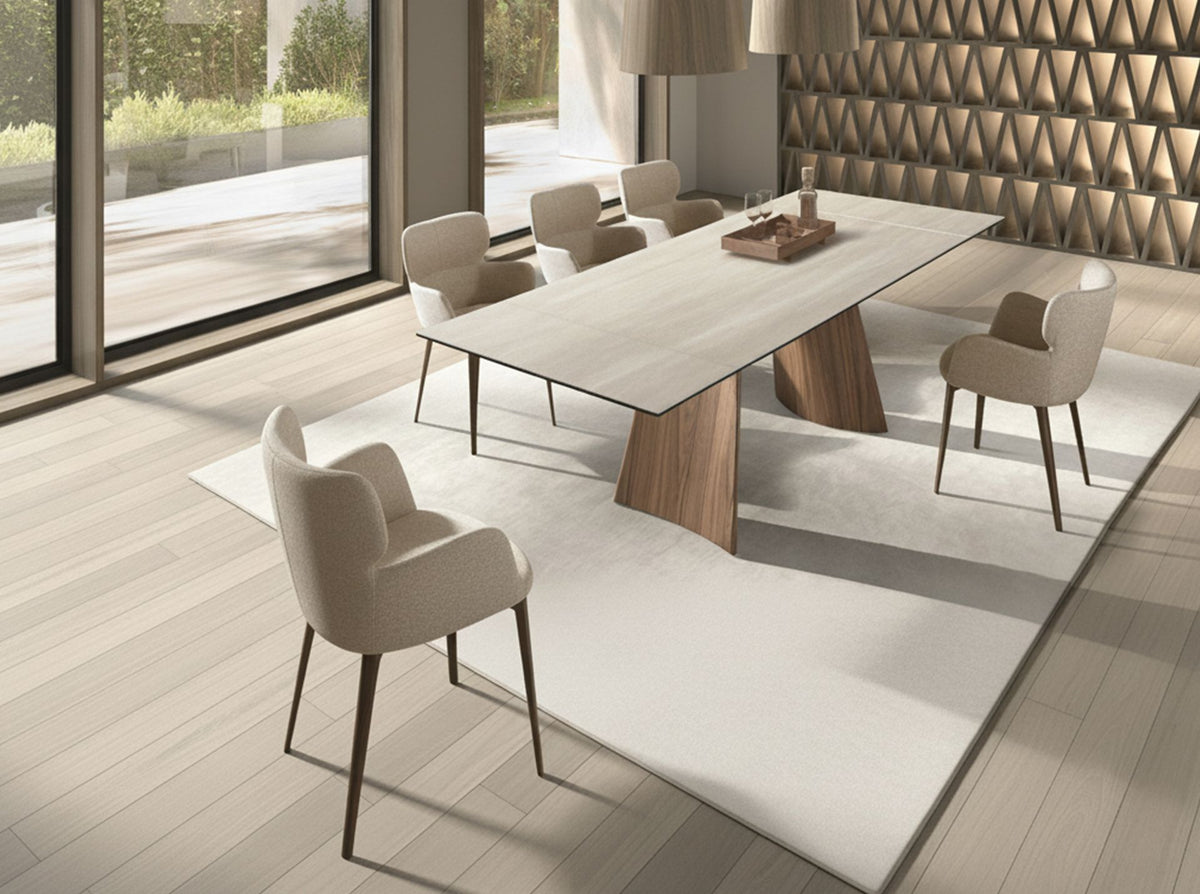 Modern design rectangular extendable dining tablewithsand-coloured porcelain marble top in matt finish. Itsstainless steel legs lacquered imitation walnut woodand its adaptability make it a fully functional and versatile piece of furniture for everyday use.