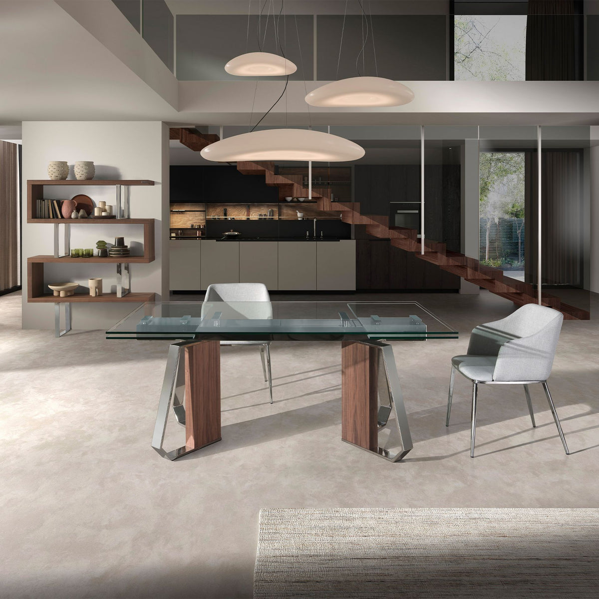 Modern rectangular extendable dining tablewithtempered glasstop. Its0.5 mm thick natural walnut veneered wood legs and chromed stainless steel, as well as its adaptability, make it a fully functional and versatile piece of furniture for everyday use.