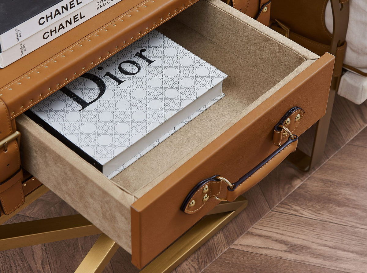- Both for itsoriginal suitcase designand itscamel-coloured leather upholstery, this piece of furniture is perfect for adding a touch of avant-garde and warmth to your home.