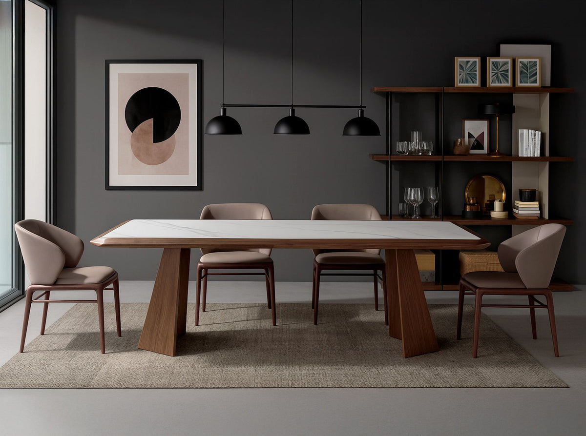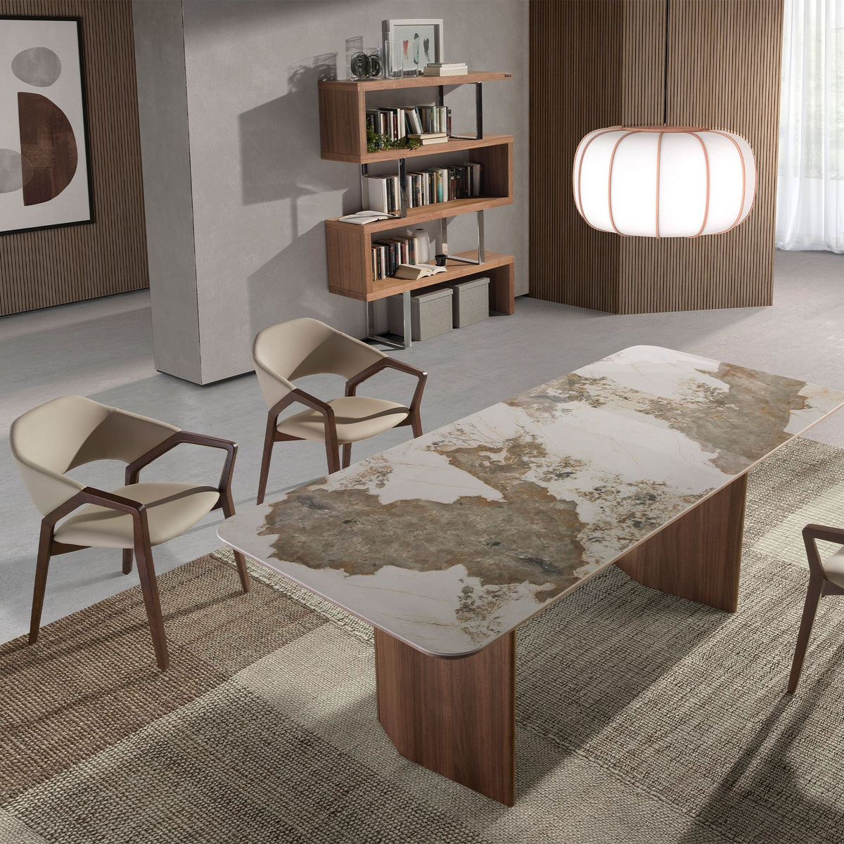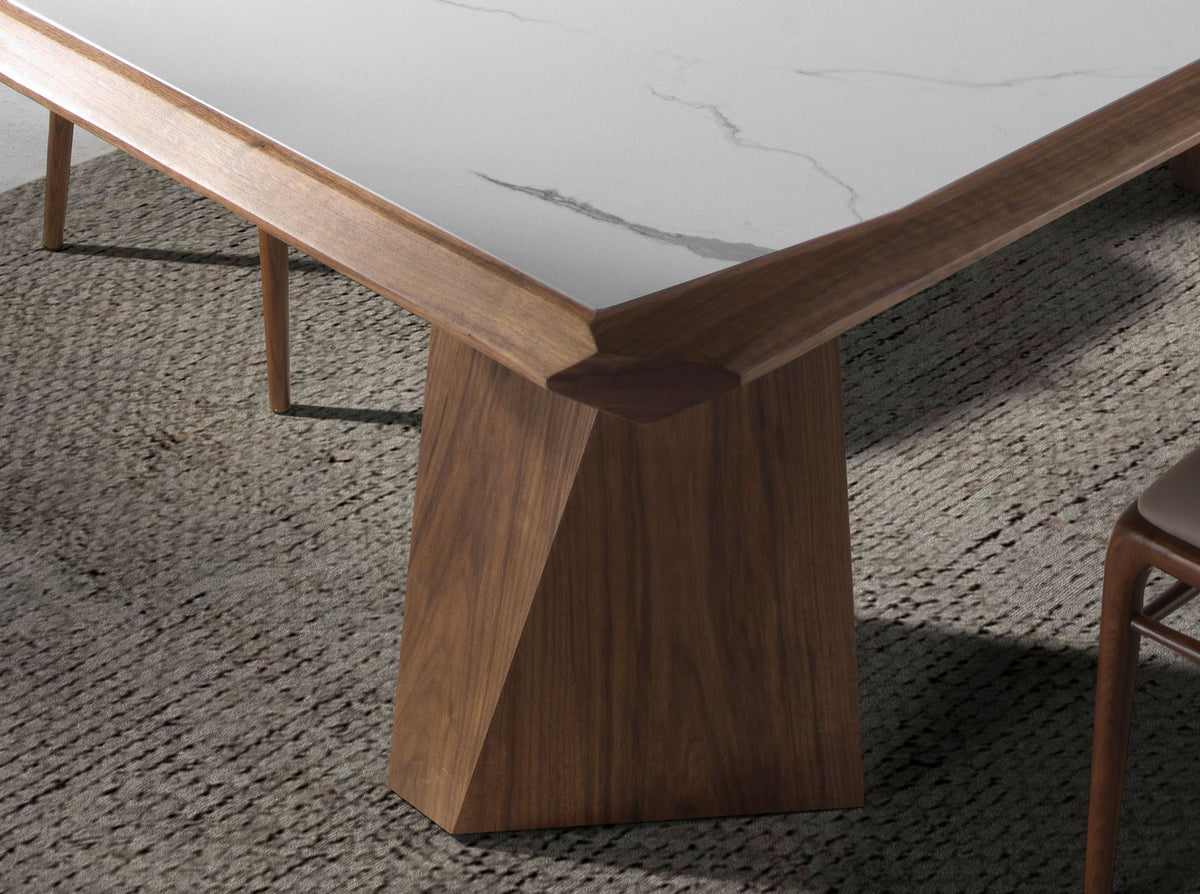 Modern design rectangular dining table with fixed top in porcelain marble. Its original wooden legs in natural walnut veneer are key elements to highlight its design.