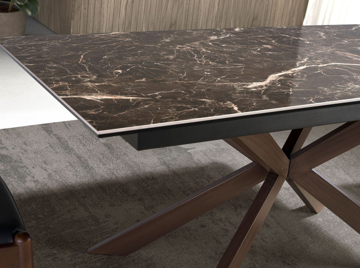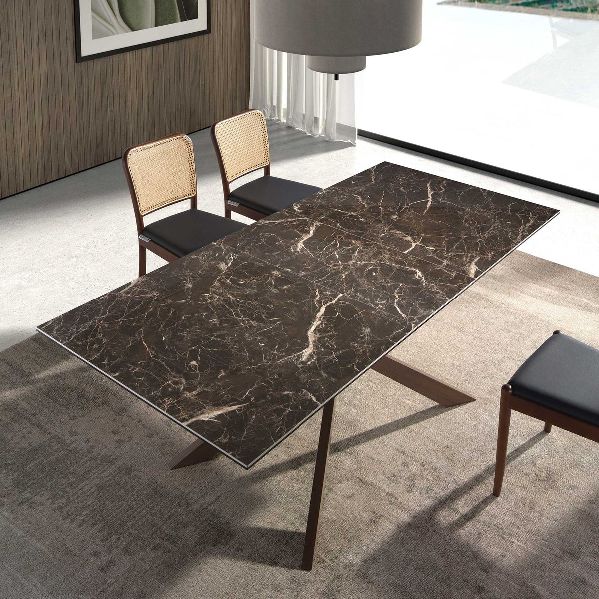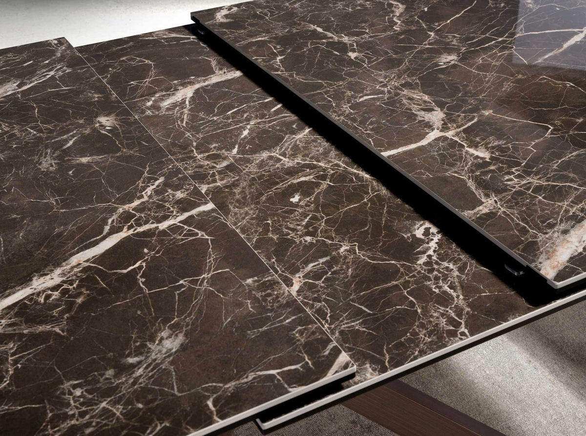 Modern design rectangular extendable dining tablewith top inbrown porcelain marble with cream veins in glossy finish. Itsstainless steel legs lacquered imitation walnut woodand its adaptability make it a fully functional and versatile piece of furniture for everyday use.
