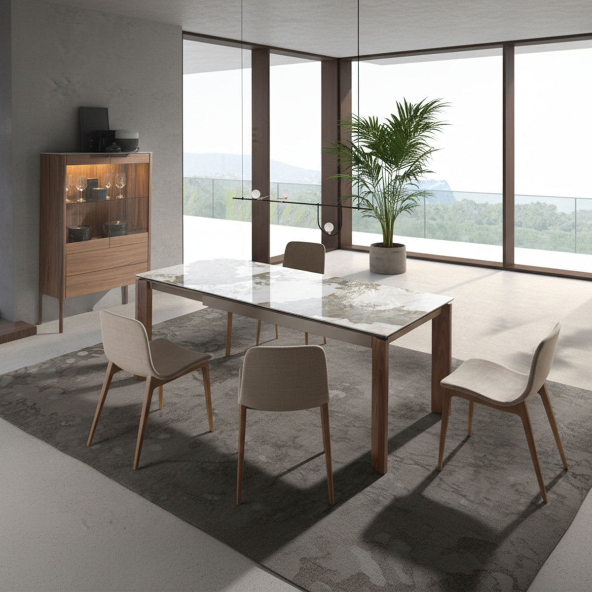 Modern design rectangular extendable dining tablewithwhite porcelain marble top with veins in earth tones in glossy finish. Itsnatural walnut veneered woodenlegs and its adaptability make it a fully functional and versatile piece of furniture for everyday use.