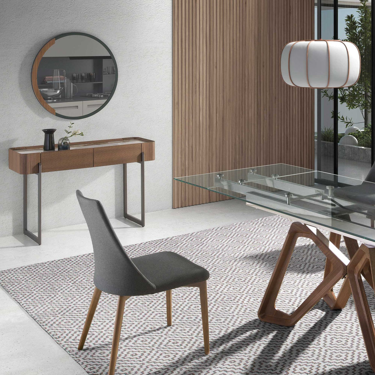 Rectangular modern design console table made of natural walnut veneered wood and an elegant white porcelain marble top with earth-toned veins in a gloss finish. Its structure of dark metallic stainless steel legs provides the modern and avant-garde touch that you are looking for in your home. It has ample storage space with 2 drawers with fingernail opening and soft-closing system.