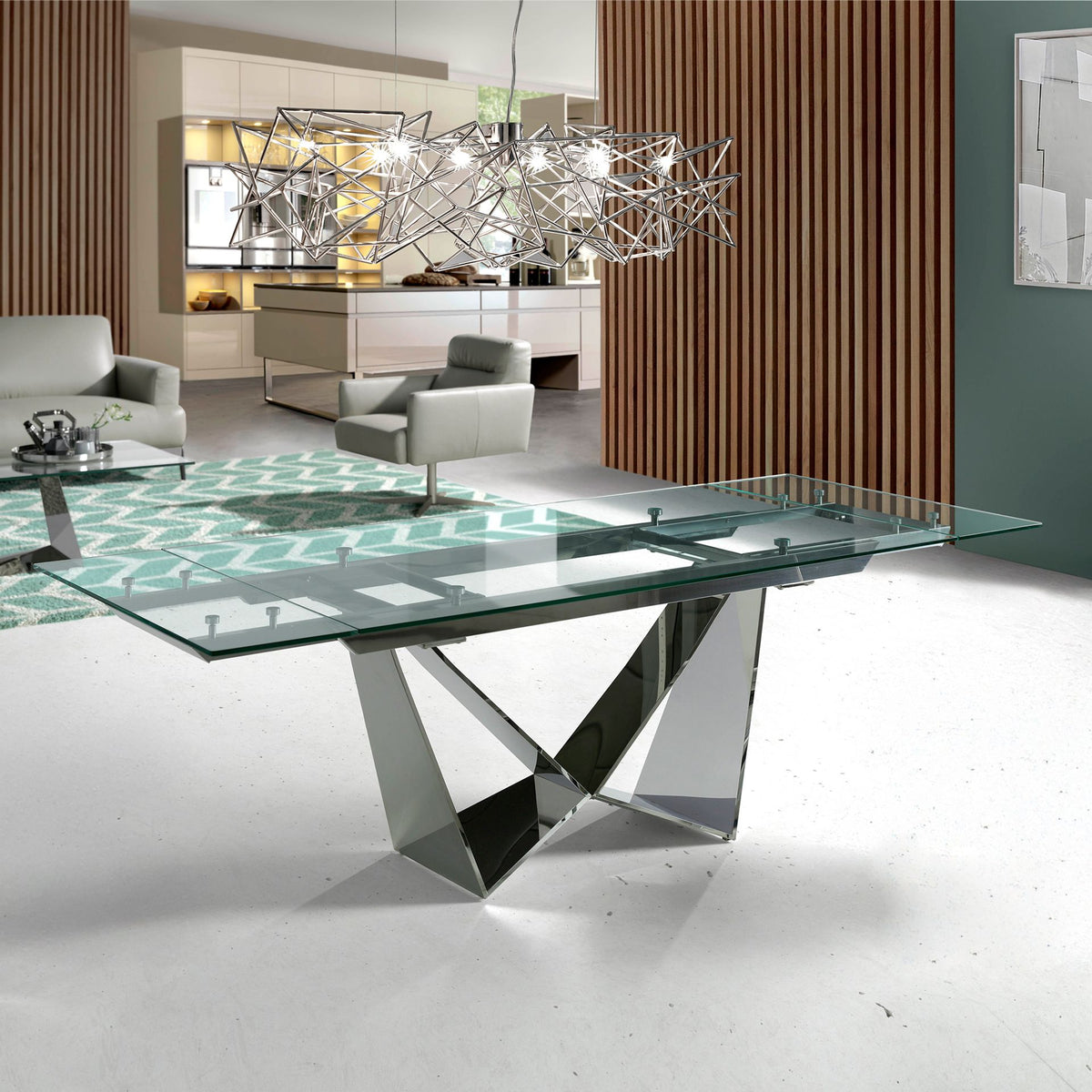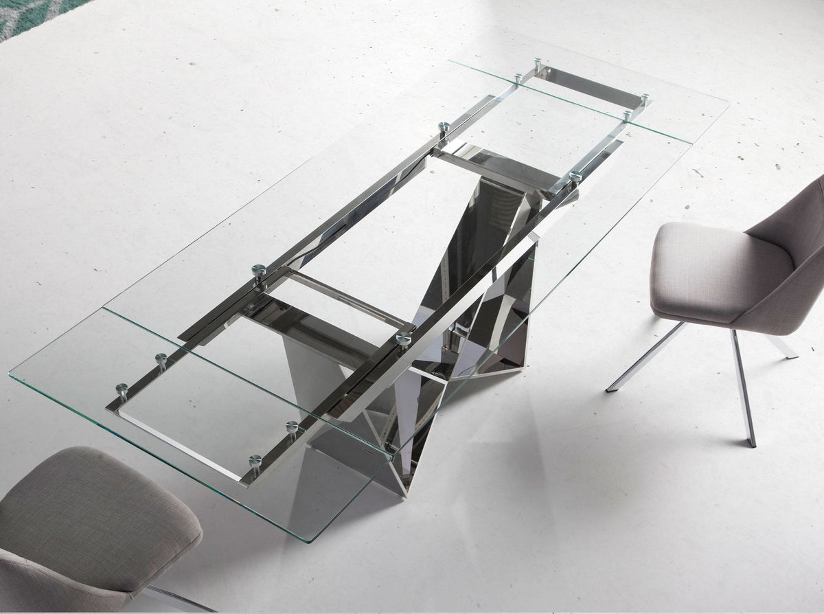 Modern design rectangular extendable dining table with tempered glass top. Its chromed stainless steel legs and its adaptability make it a totally functional and versatile piece of furniture for everyday use.