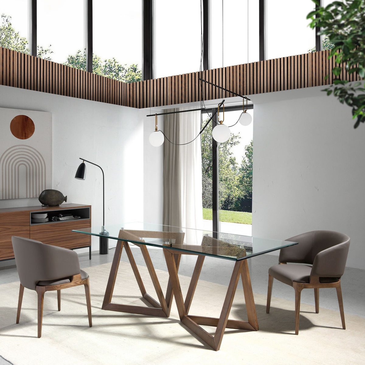 Modern rectangular dining table with fixed tempered glass top. Its original legs in natural walnut veneer are key elements of its design.