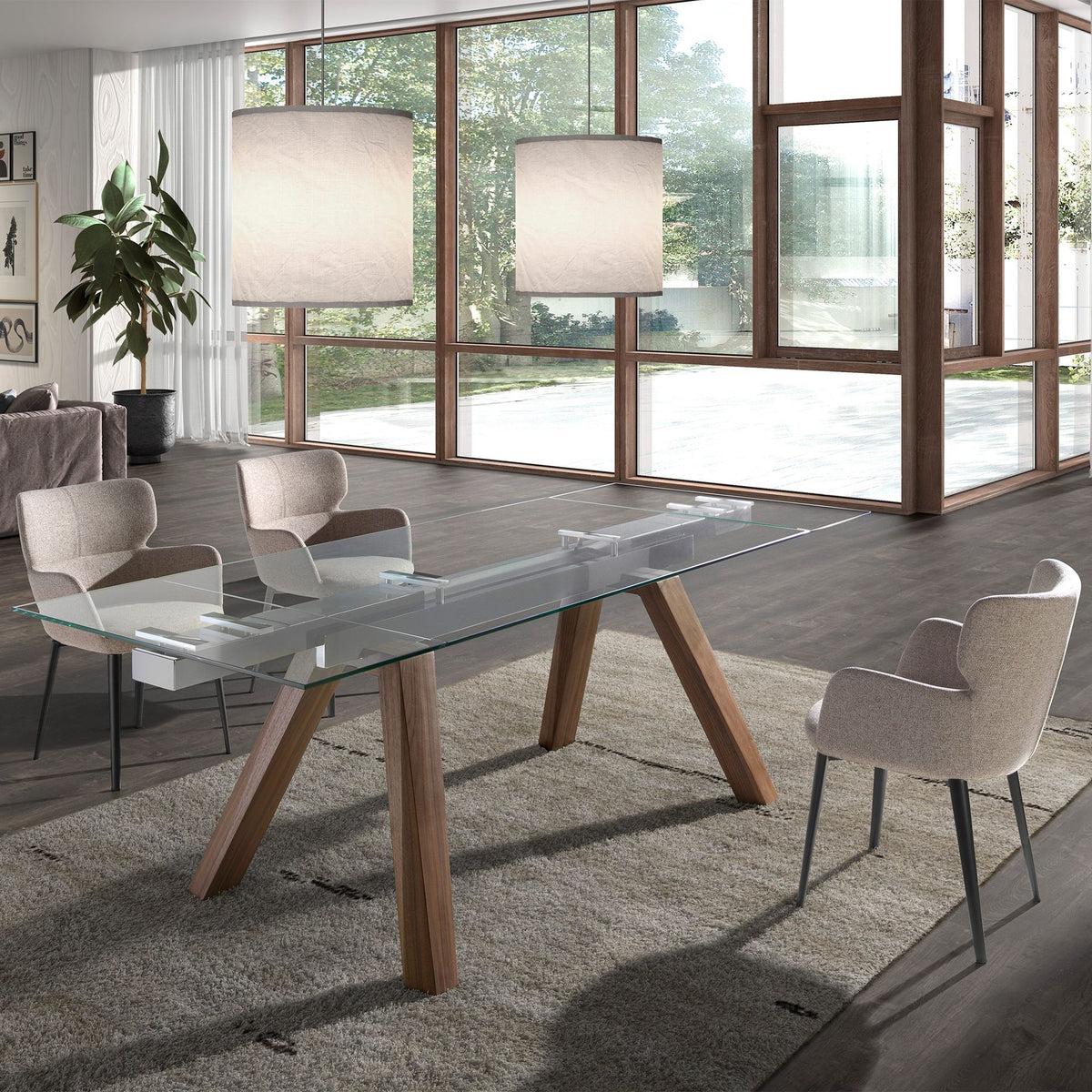 Modern design rectangular extendable dining tablewithtempered glasstop. Itsnatural walnut veneered woodenlegs and its adaptability make it a fully functional and versatile piece of furniture for everyday use.