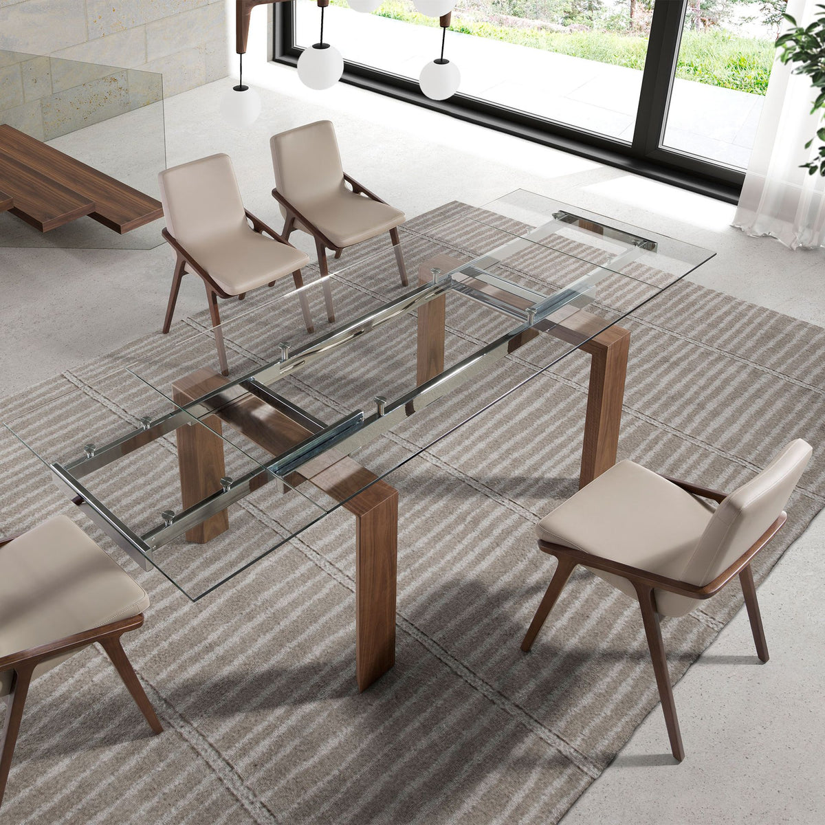 Modern rectangular extending dining table with tempered glass top. Its natural walnut veneered wooden legs and its adaptability make it a totally functional and versatile piece of furniture for everyday use.