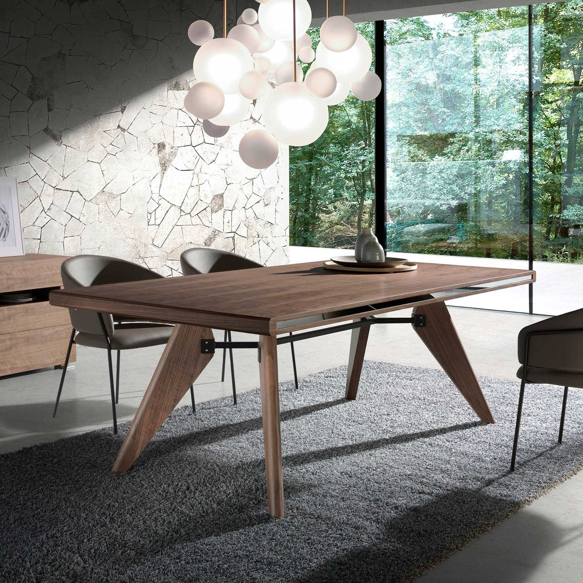 Modern design rectangular dining table with fixed top and natural walnut veneered wood structure. A perfect table to bring brightness and modernity to your kitchen, living room or dining room.