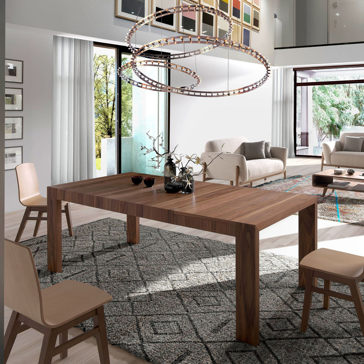 Modern design rectangular extendable dining table with top and structure in natural walnut veneer. Its elegant style, as well as its adaptability, make it a totally functional and versatile piece of furniture for everyday use.