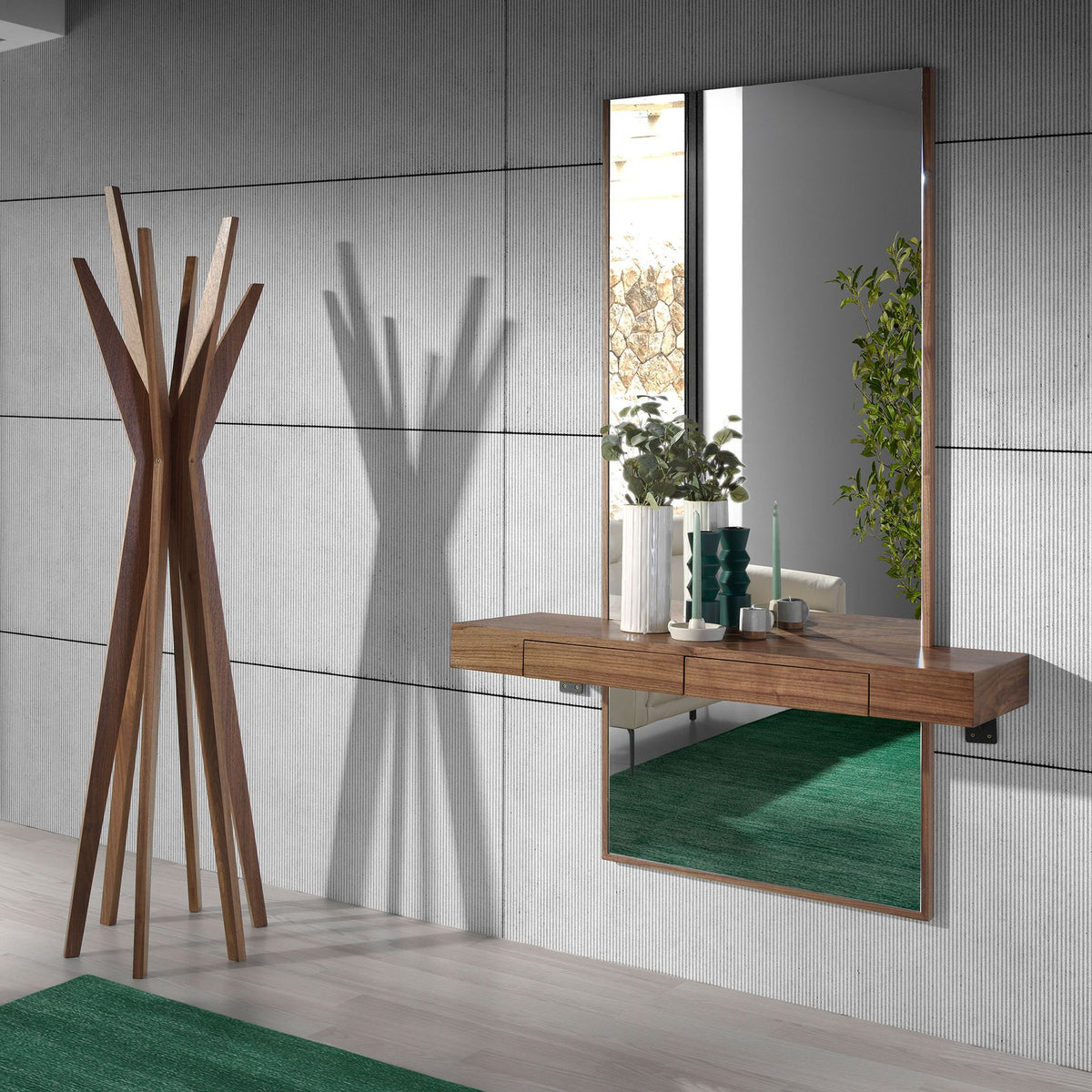 Rectangular hall mirror with a modern designand anatural walnut veneered woodframe. This vertical hallway is ideal for creating an elegant and avant-garde atmosphere, providing agreater sense of spaciousness and luminosity. It has alarge storage space with 2 drawers with a finger-joint opening system and a soft-closing system.