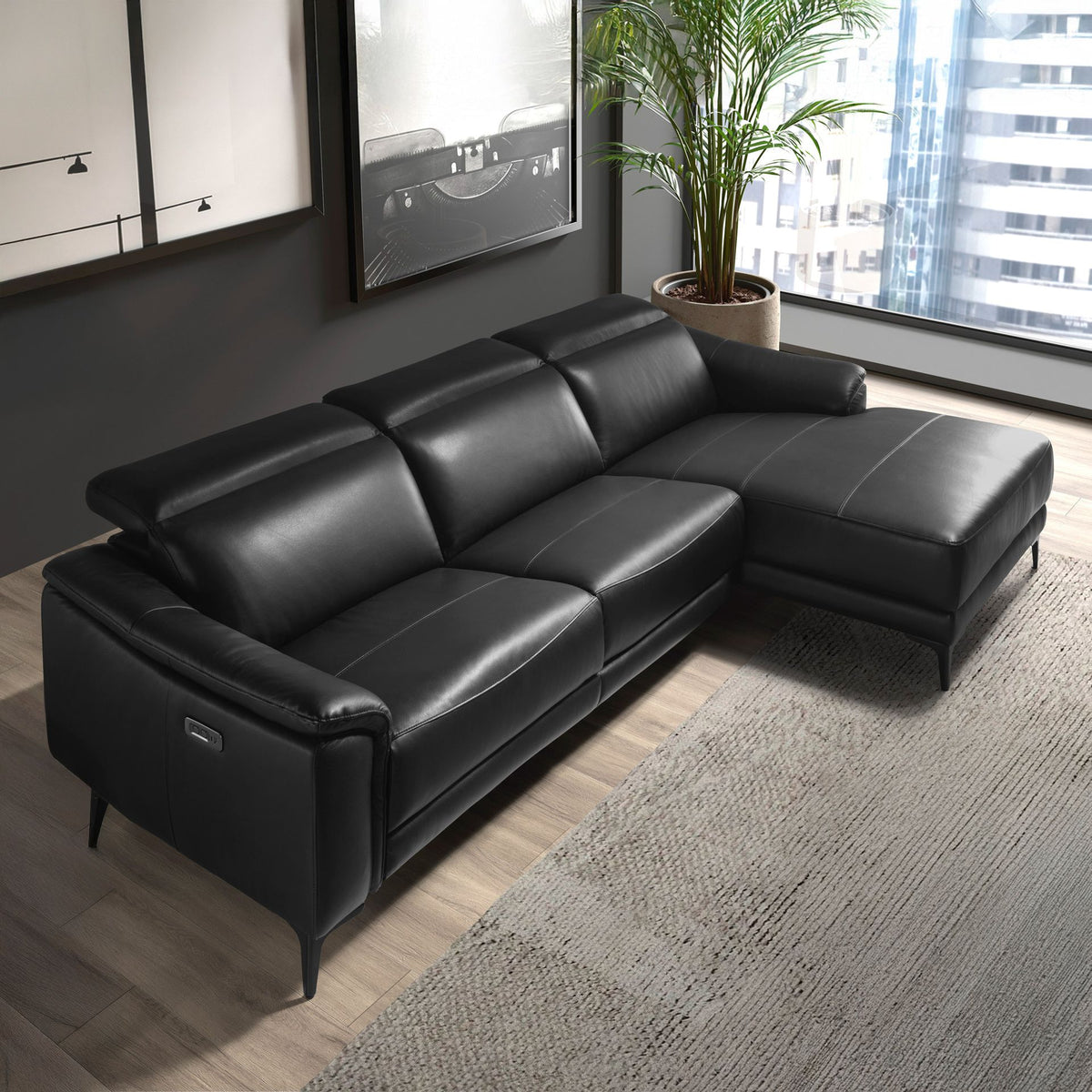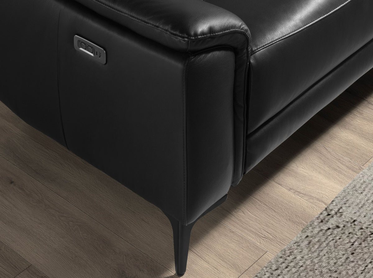 5 seater chaise longue relax right sofa with modern designupholstered inblack cowhide leatherwith headrest to ensure greater comfort. Both for its style and itsblack stainless steellegs, this sofa will bring a touch of avant-garde and elegance that you are looking for in your home.Itselectric relaxation systemgives you the extra comfort you need to relax.