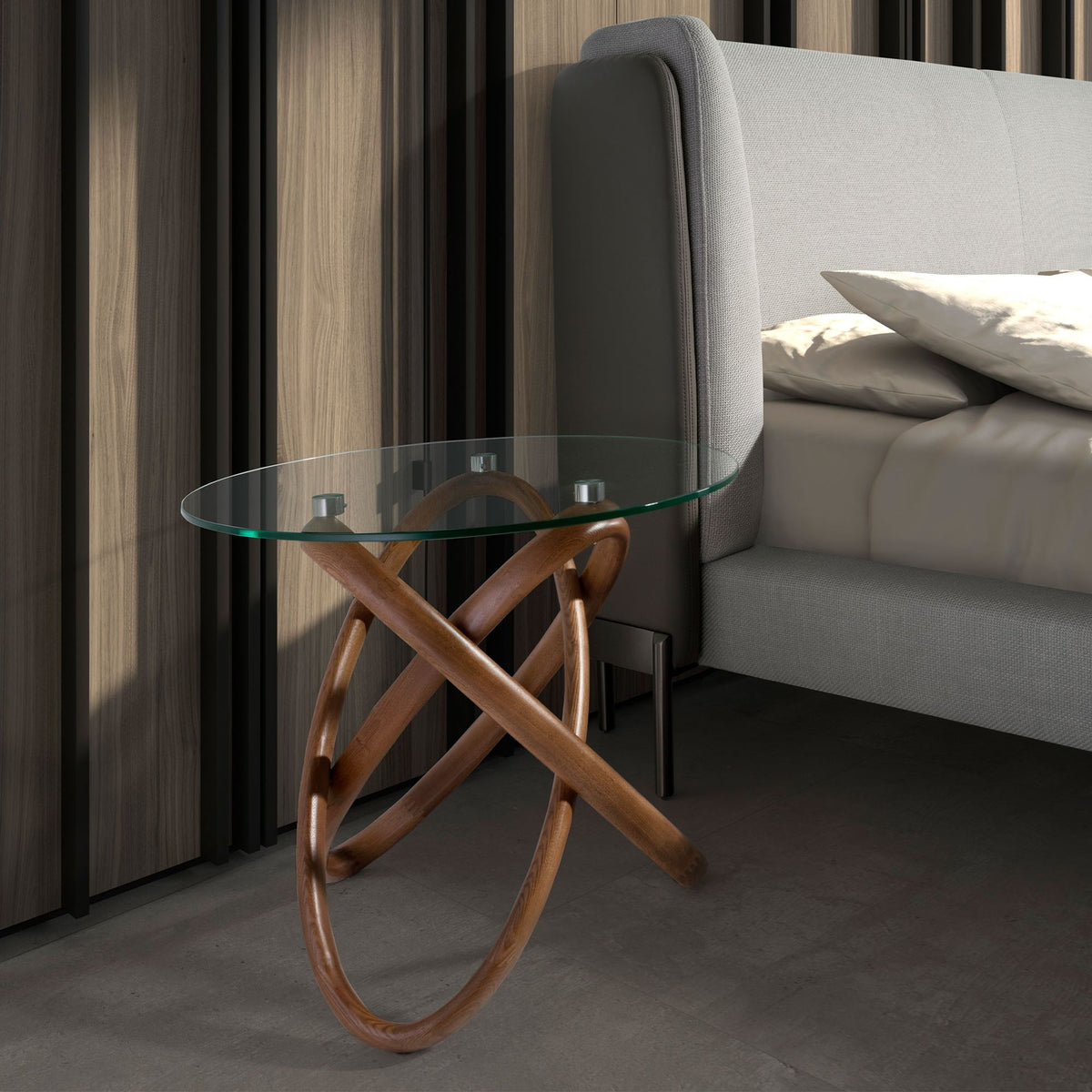 Round corner table in tempered glass and walnut