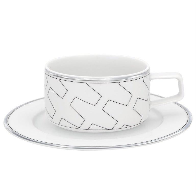 Introducing the Trasso Tea Cup & Saucer, an exquisite addition to your contemporary dinnerware collection. Featuring sleek geometric lines and luxurious platinum accents, this elegant set is perfect for enjoying your favorite teas in style.