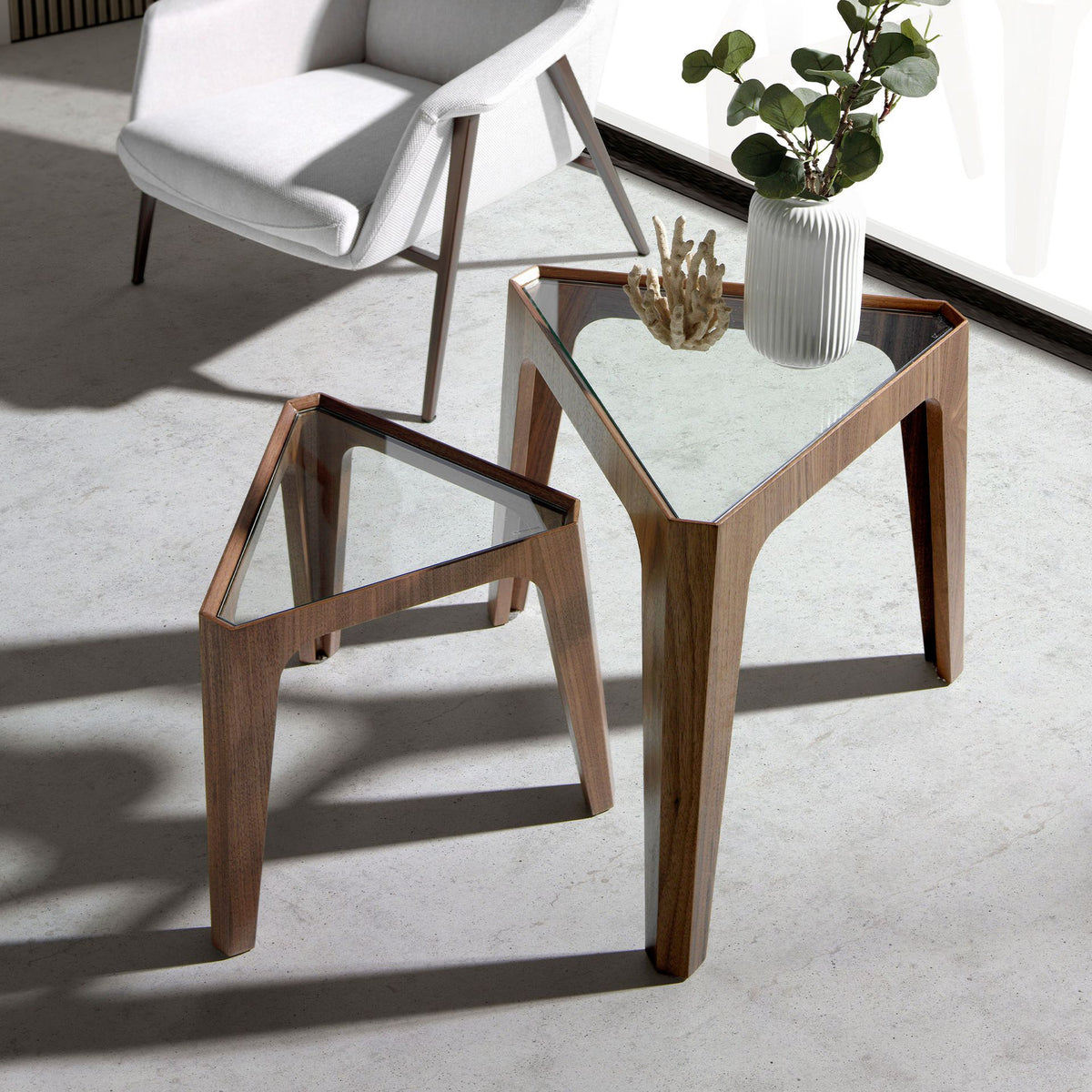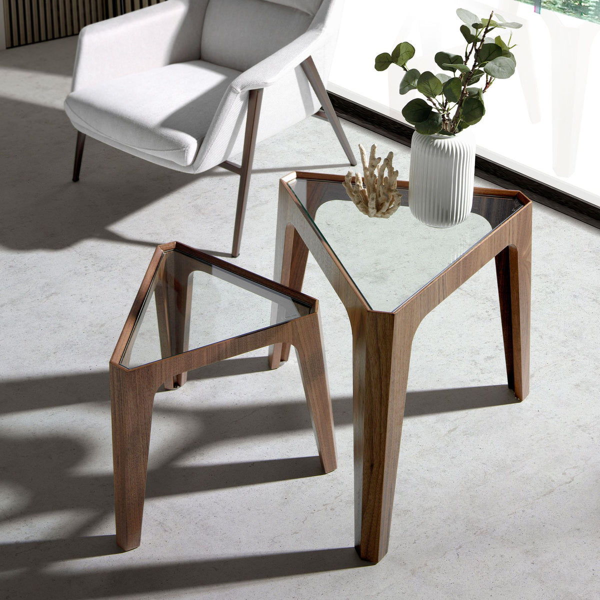 Triangular corner table of modern designwithtempered glasstop and originalwooden legs veneered in natural walnut. A piece with asimple yet original designthat will add a unique and personal touch.