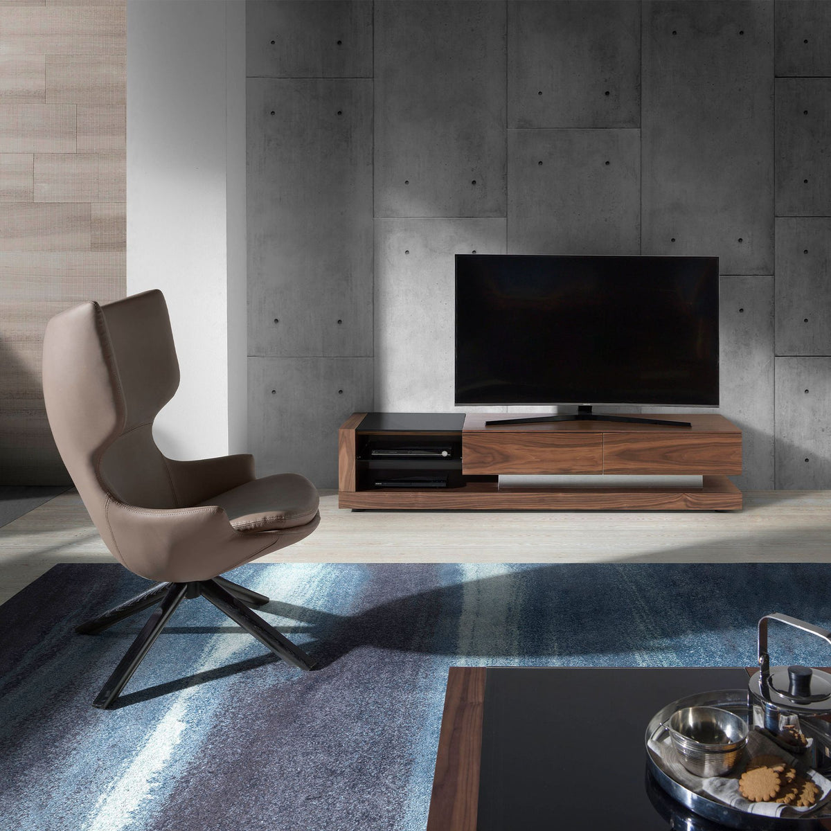 Modern design TV stand with natural walnut veneered wood structure and original polished stainless steel legs. Thanks to its elegant black tinted glass top, you will get the sophisticated look you are looking for in your rooms. Its original polished stainless steel detailing adds the perfect touch of style to your living room. It has ample storage space with 2 drawers with a fingernail opening system and soft-closing system.