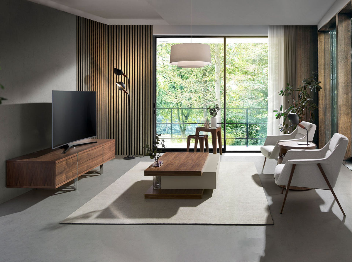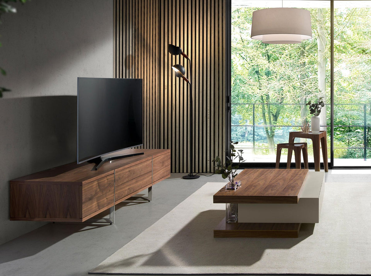 Modern design TV stand with natural walnut veneered wood structure and original chromed stainless steel legs. Its original chrome-plated stainless steel detail adds the perfect touch of style to your living room. It has a large storage space with 2 drawers with push and pull opening system and soft-closing system, and 2 doors with push and pull opening and closing system.