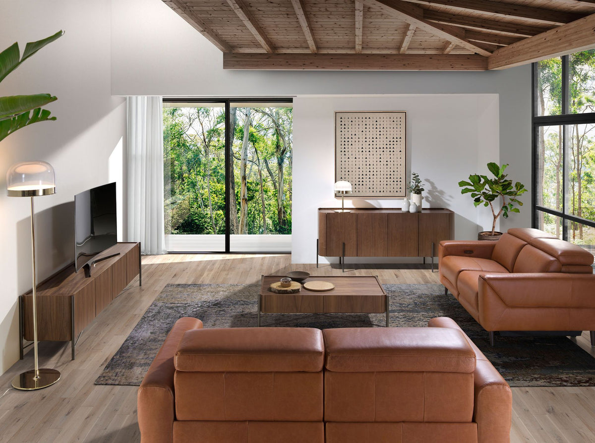- An elegant and sophisticatedtv stand made of 0,5 mm thick natural walnut veneer, which will give your living room the modern and warm touch you are looking for.