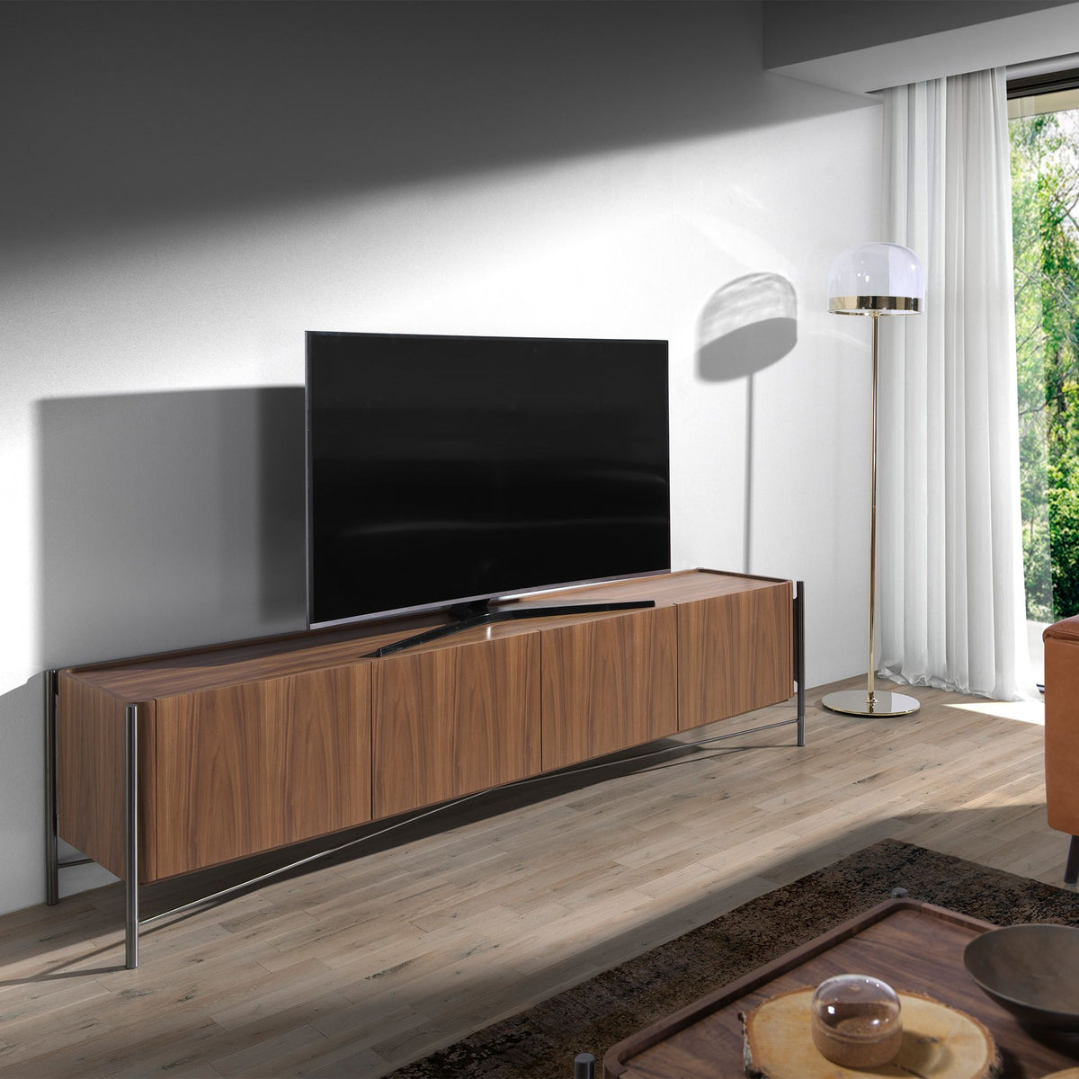 Modern design TV standwithwooden structure in natural walnut veneerandoriginal legs in darkened stainless steel. It has alarge storage spacewith4 doorswithfingernail opening systemandsoft-closing system.