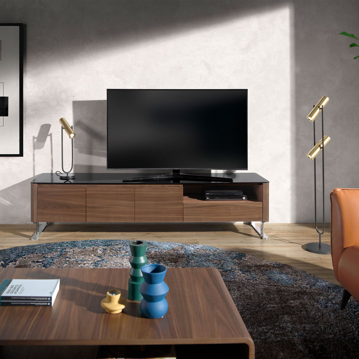 Modern design TV stand with natural walnut veneered wood structure and original chromed stainless steel legs. Thanks to its elegant black tinted tempered glass top, you will get the sophisticated look you are looking for in your rooms. It has a large storage space with 1 drawer with a fingernail opening and soft-closing system, and 3 doors with a fingernail opening and soft-closing system.