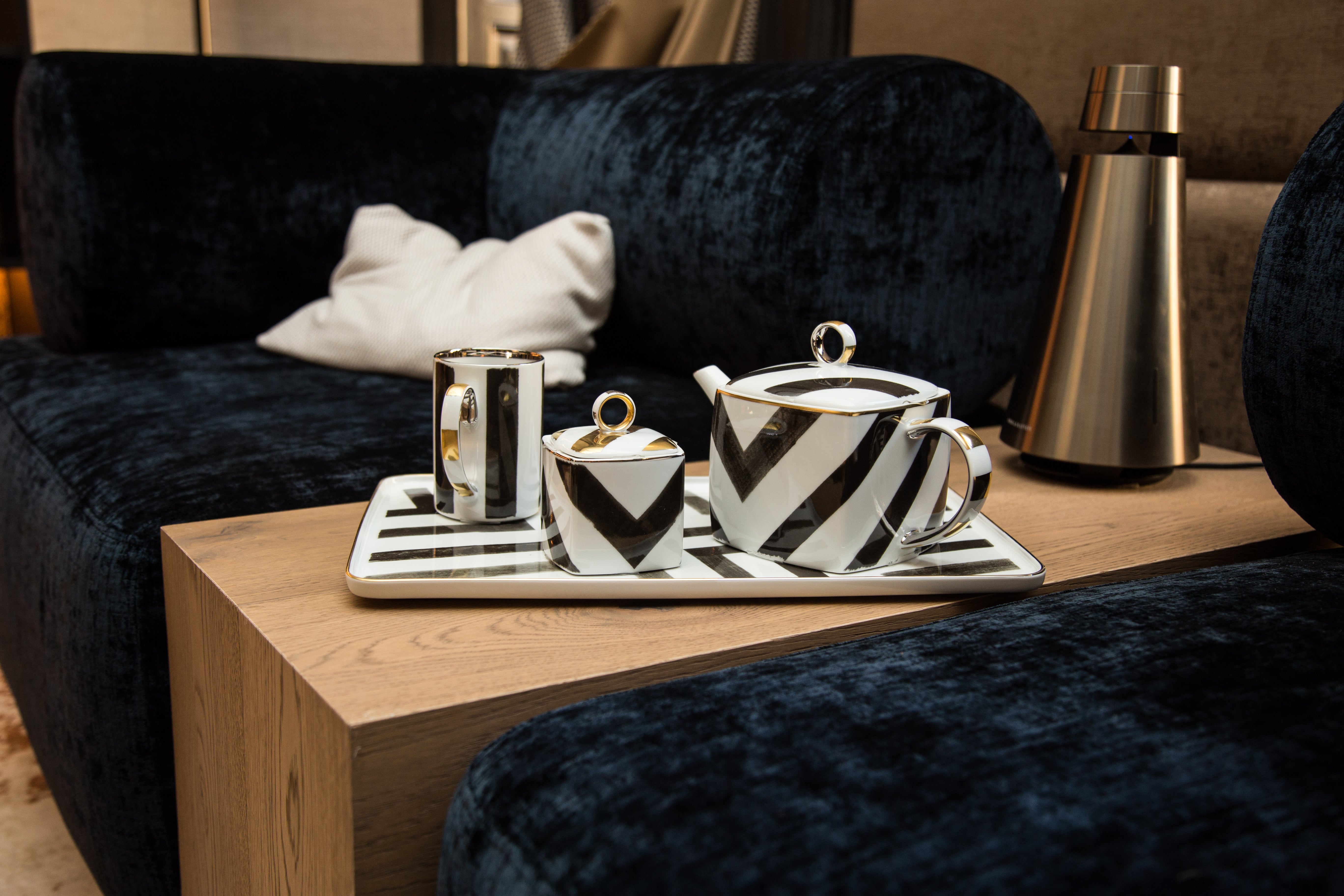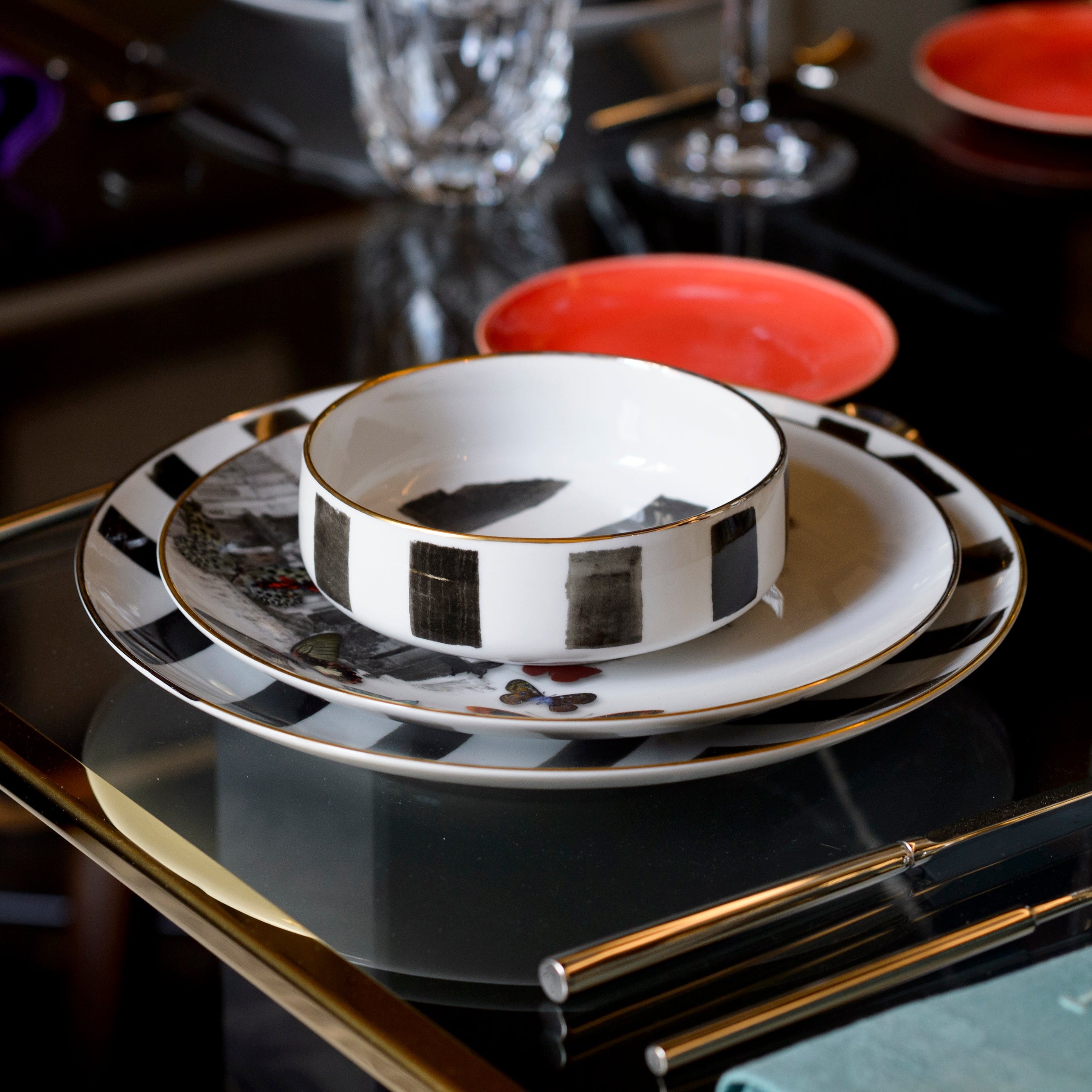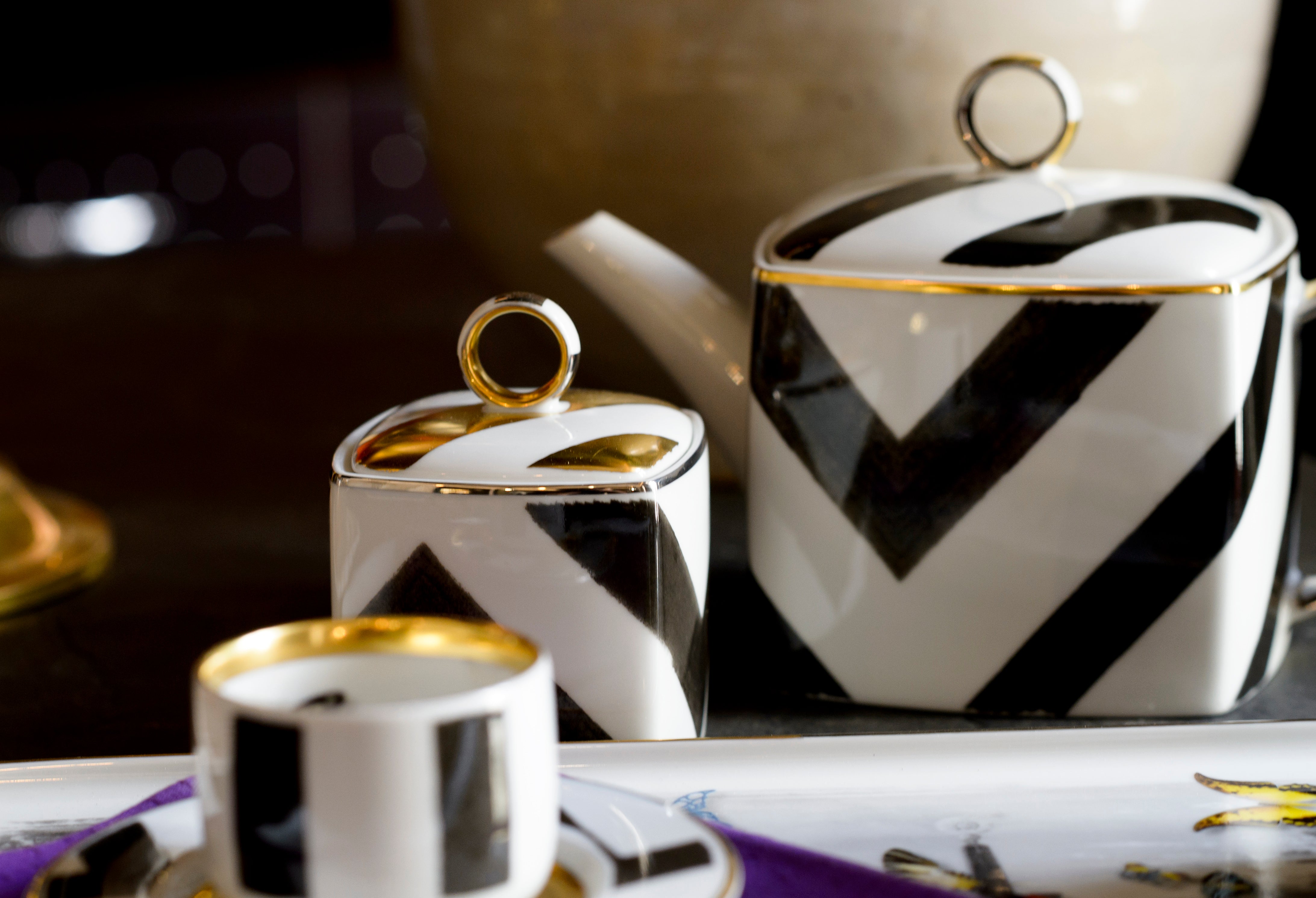 امنح مائدتك لمسة من الفخامة مع طقم صحون تقديم Sol y Sombra المكوّن من 16 قطعة من البورسلين الراقي، بتصميم فاخر من كريستيان لاكروا.
