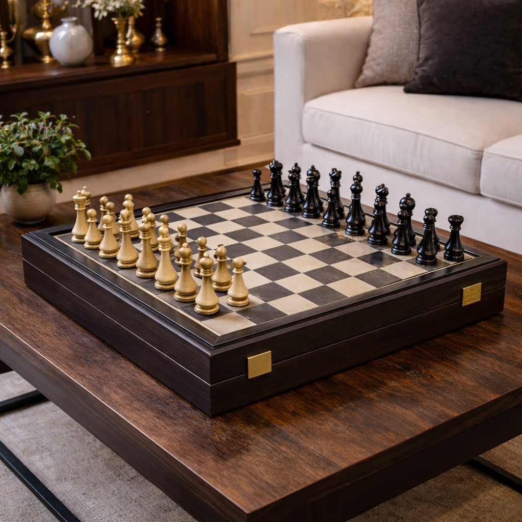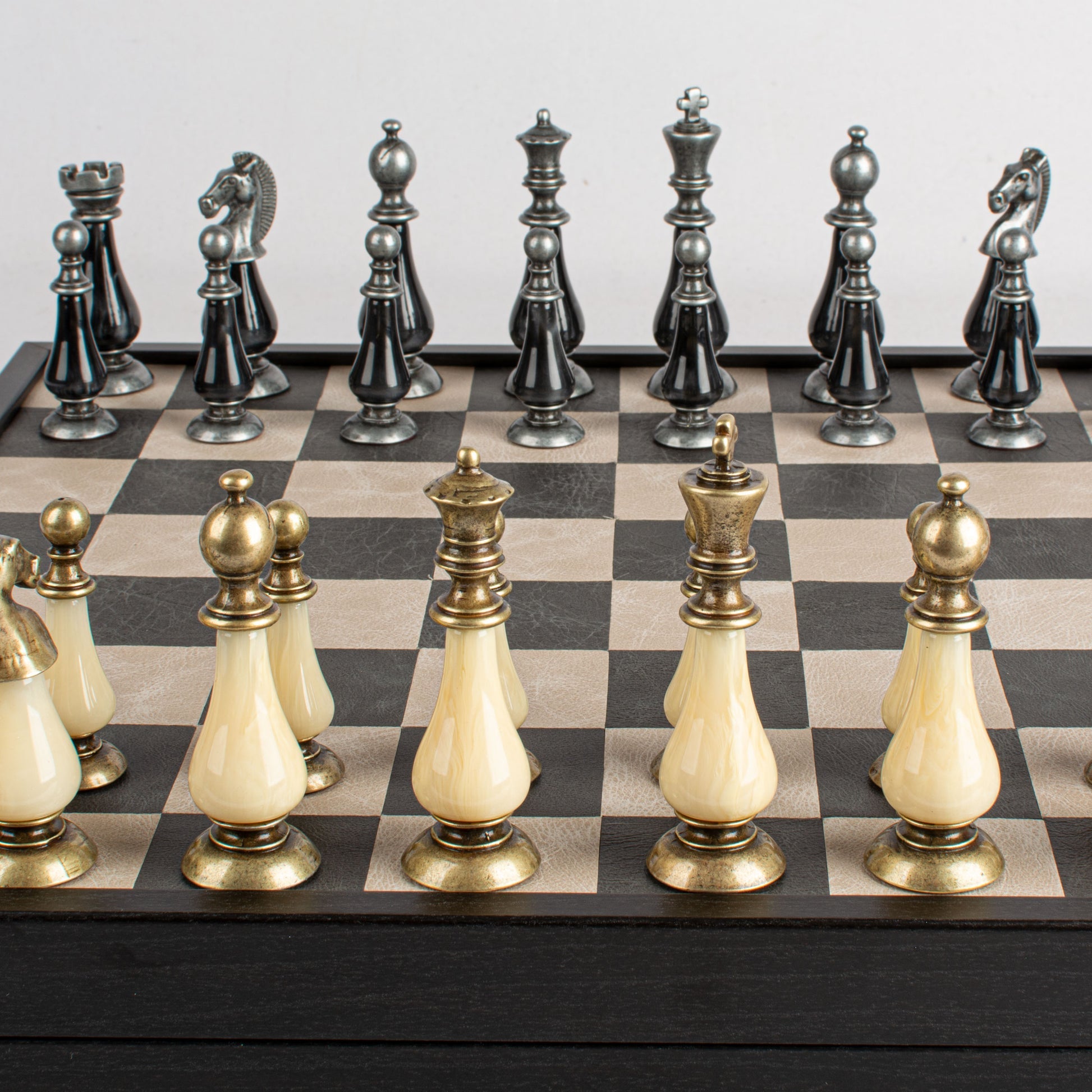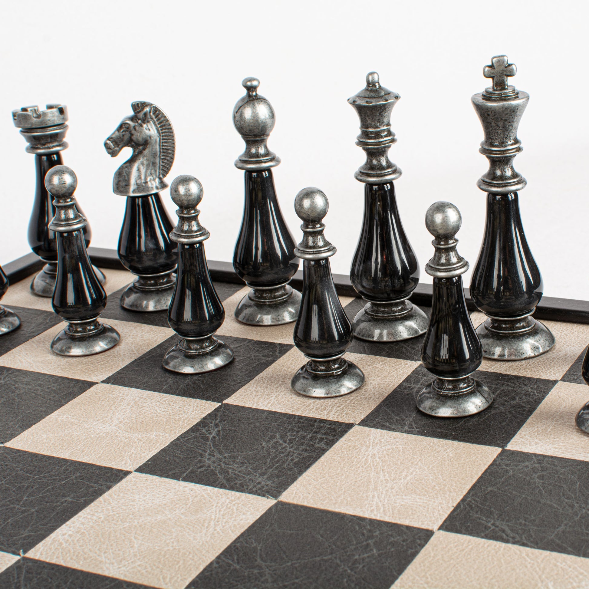 تتميز هذه المجموعة بسطح لعب جلدي فاخر بلونين متناسقين، مع قطع شطرنج معدنية مصقولة يدويًا بتشطيب من النحاس والقصدير، مما يضفي لمسة فنية فريدة.