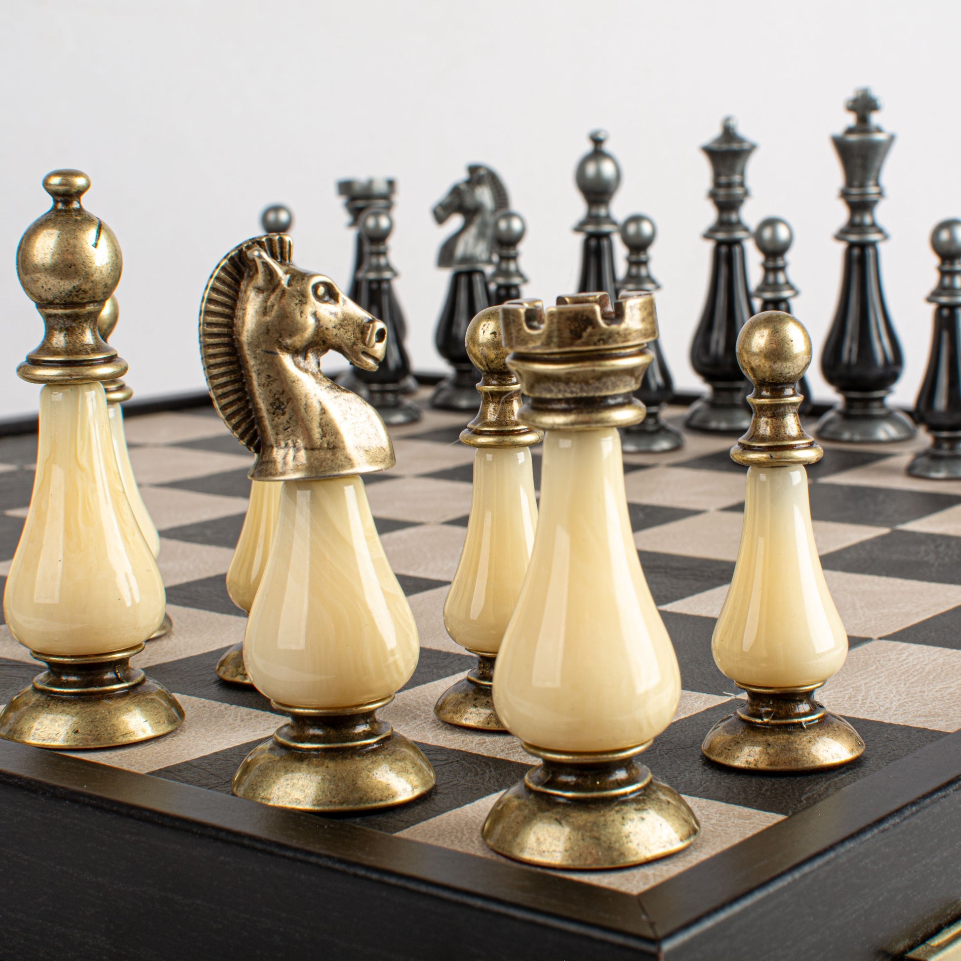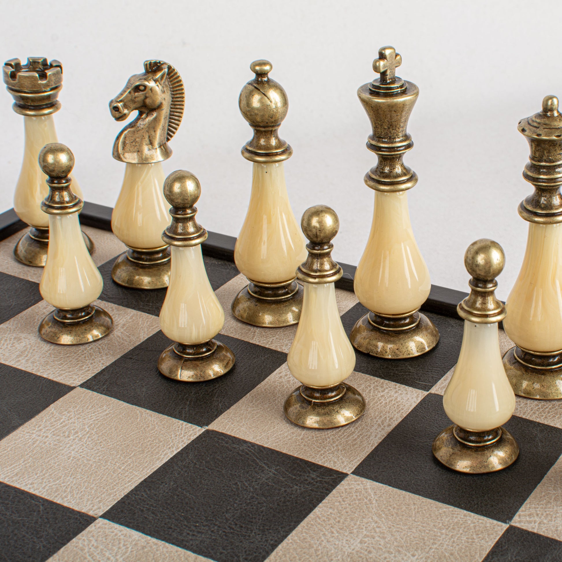 - القطع: 32 قطعة شطرنج معدنية مصقولة يدويًا بتشطيب من النحاس والقصدير.