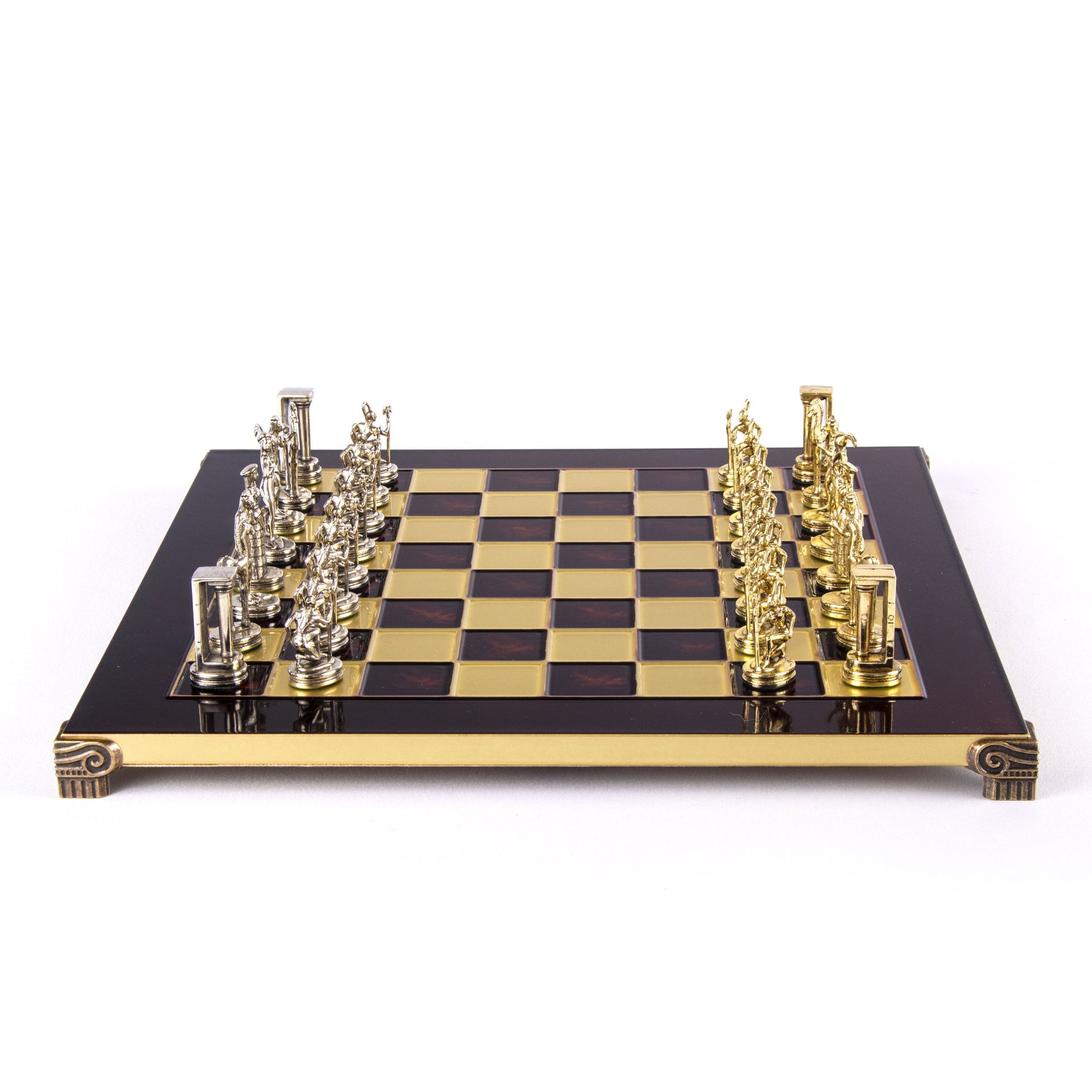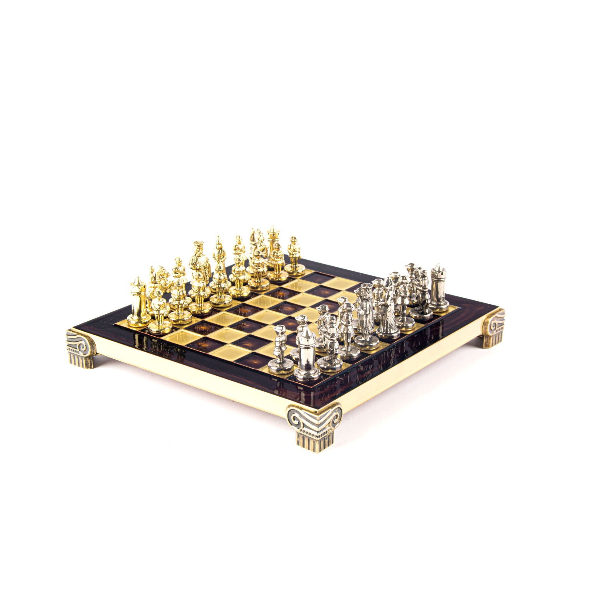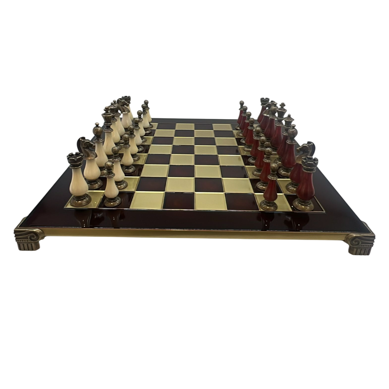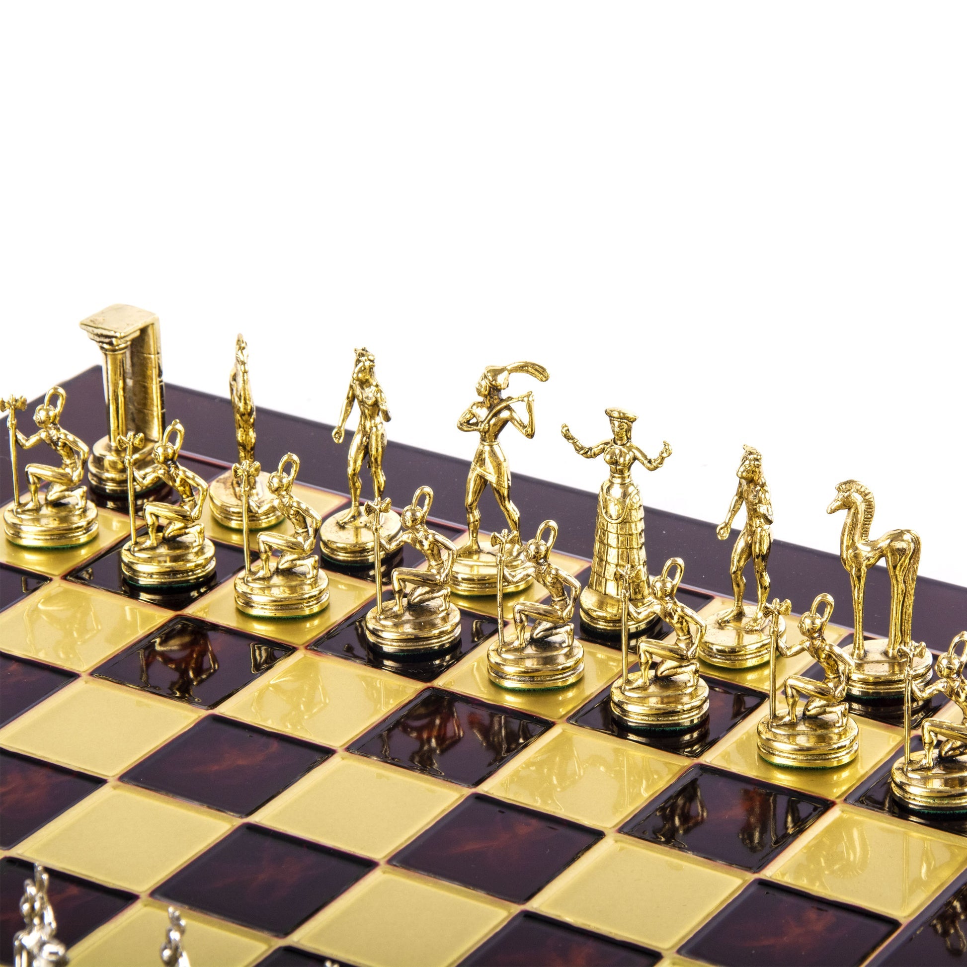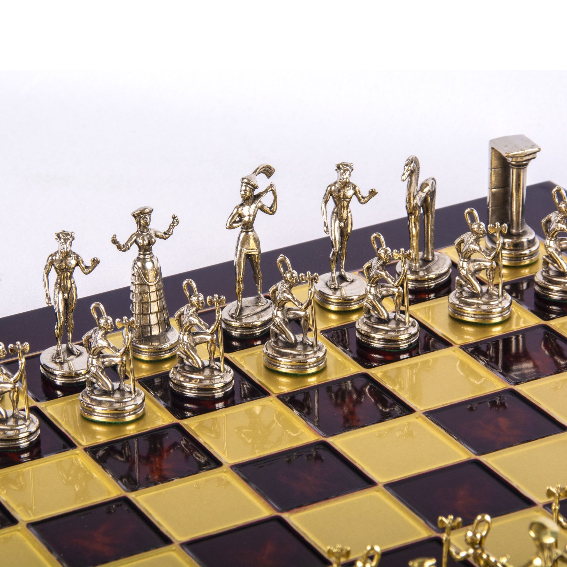 - القطع: 32 قطعة شطرنج معدنية مصقولة يدويًا، بتفاصيل فنية دقيقة.