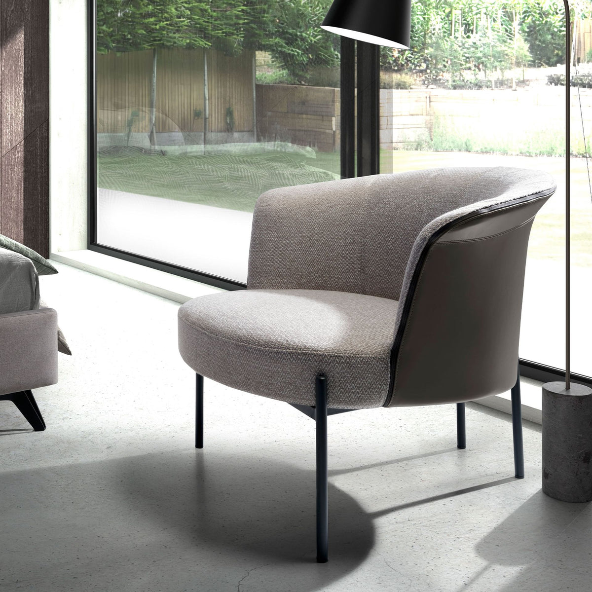 كرسي ذو ذراعين بتصميم عصري، حيث المقعد مُغطى بقماش باللون الرمادي ومسند الظهر مُغطى بجلد صناعي باللون الرمادي الداكن. سواءً من حيث أسلوبه أو أرجله المصنوعة من الفولاذ المقاوم للصدأ والمطلية بالإيبوكسي الأسود، فإن هذا الكرسي يمثل المزيج المثالي بين التصميم والراحة.