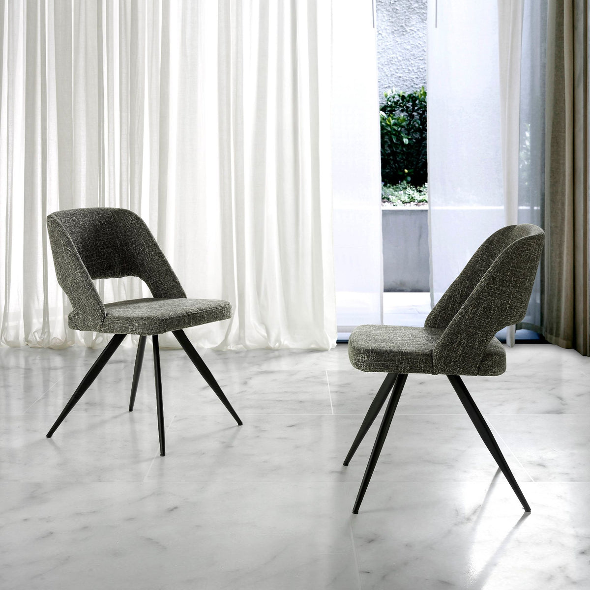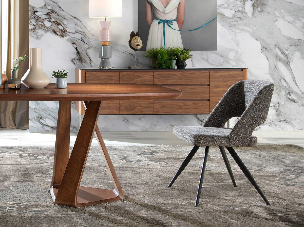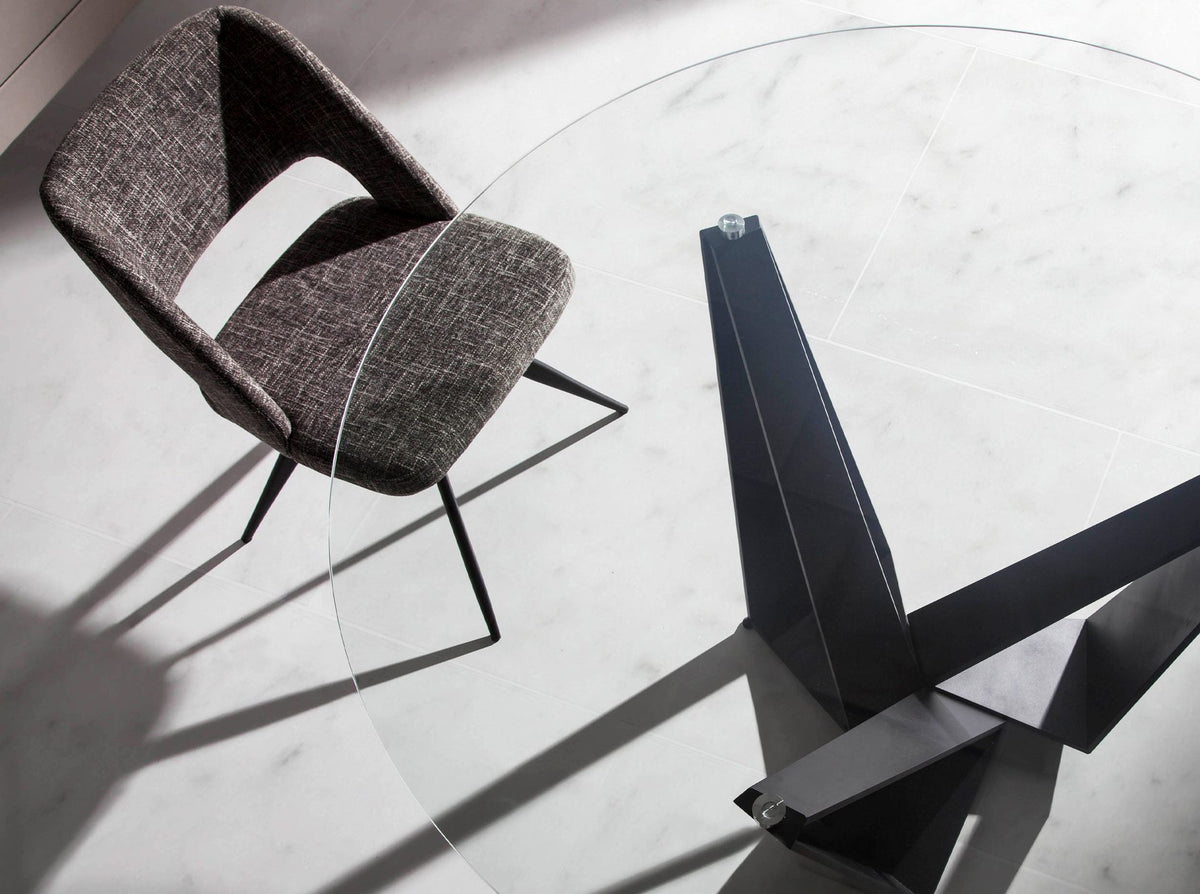 كرسي بتصميم عصري مع مقعد وظهر مكسوّان بقماش رمادي. ستجعل منه أرجله المصنوعة من الفولاذ المقاوم للصدأ الأسود ذات الطابع الطليعي الخالد قطعة أساسية في مطبخك أو غرفة طعامك. يجمع هذا الكرسي من تصميم أنخيل ثيردا بين الطابع الفريد والشخصي للعلامة التجارية، بالإضافة إلى أعلى درجات الراحة والثبات، وذلك بفضل الجودة العالية للتنجيد والتصميم الأصيل لأرجله.