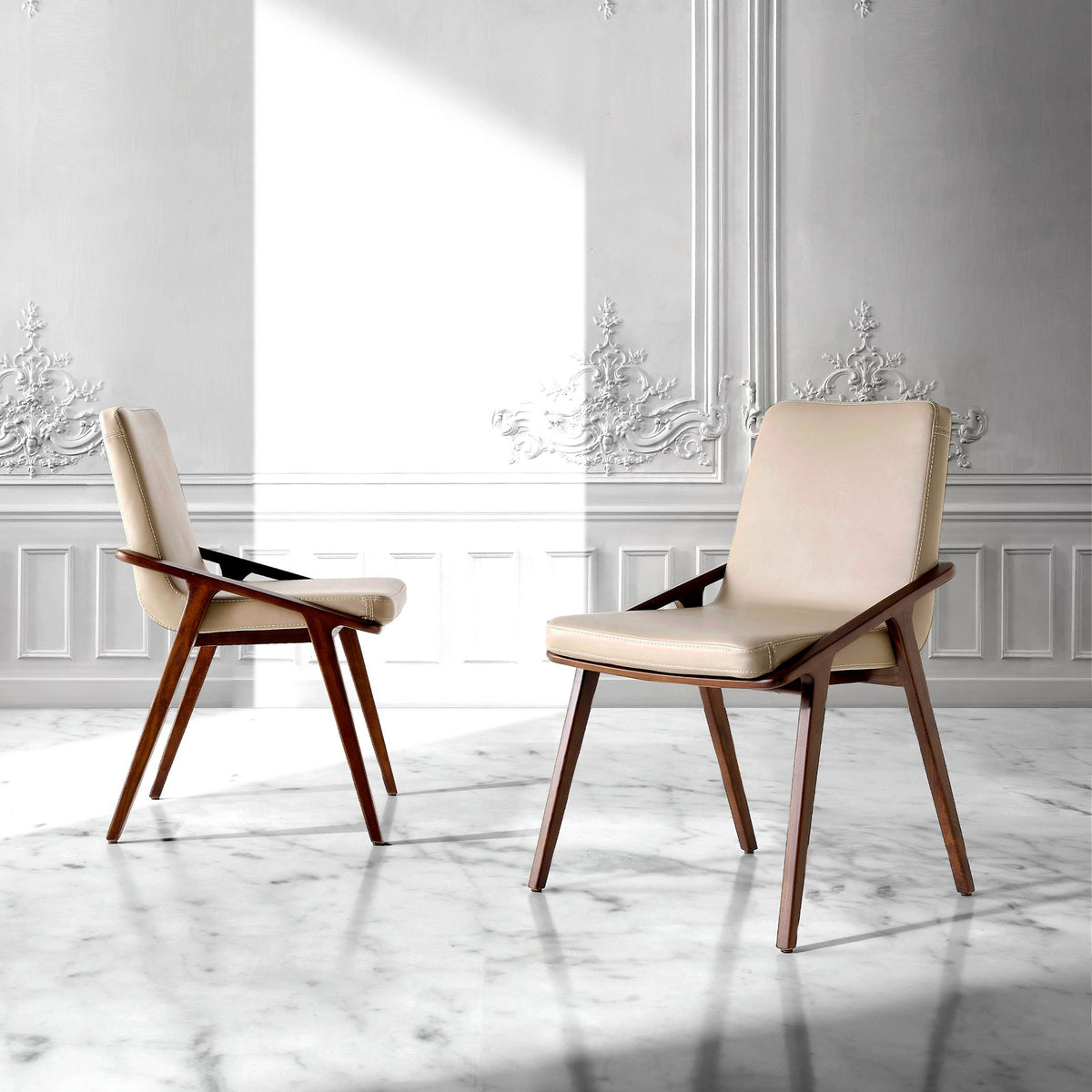 كرسي من الجلد الصناعي بلون المنك موديل 4019 من أنخيل ثيردا إس.إل. كرسي بتصميم عصري مع مقعد وظهر مبطّنين بجلد صناعي بلون المنك. ساقاه الخشبيتان بلون الجوز، بأسلوب طليعي معاصر، تجعلانه عنصراً أساسياً لا غنى عنه لمطبخك أو غرفة طعامك. يجمع هذا الكرسي من أنخيل ثيردا بين الأسلوب الفريد والشخصي للعلامة التجارية، بالإضافة إلى أقصى درجات الراحة والثبات، وذلك بفضل الجودة العالية لتنجيده والهيكل الأصلي لساقيه.
