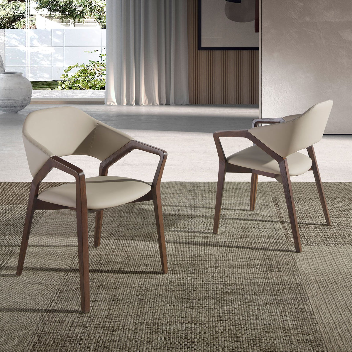 كرسي من الجلد الصناعي بلون المنك، موديل 4068 من أنخيل ثيردا إس.إل. كرسي بمساند ذراعين بتصميم عصري مع مقعد ومسند ظهر مكسوين بجلد صناعي بلون المنك. سيقانه الخشبية بلون الجوز، بأسلوب طليعي معاصر وخالد، ستجعله قطعة أساسية لا غنى عنها لمطبخك أو غرفة طعامك. يجمع هذا الكرسي من أنخيل ثيردا بين الأسلوب الفريد والشخصي للعلامة التجارية، بالإضافة إلى أعلى درجات الراحة والثبات، وذلك بفضل الجودة العالية للتنجيد والهيكل الأصيل لسيقانه.
